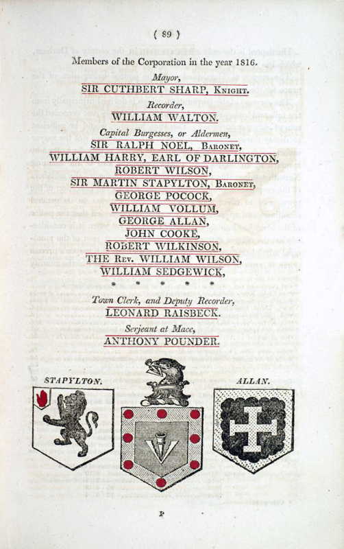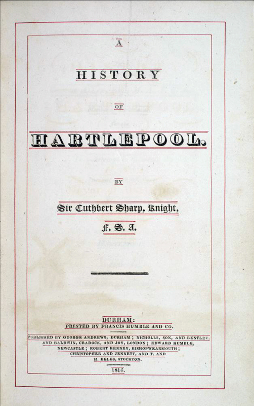 Cuthbert Sharp was born in Hartlepool and was baptised in St Hilda’s Church, next door to his family home, on June 3rd, 1781. For many years he lived in Hartlepool and became friendly with Robert Surtees, whom he helped with his History of County Durham. Inspired by this, in 1816, Sharp's History of Hartlepool was published and very well received, and in the same year, he was knighted by the Prince Regent. He was Mayor of Hartlepool in 1813, 1816, and 1824. A freemason, in 1832, he was elected Deputy Provincial Grand Master for the County of Durham.