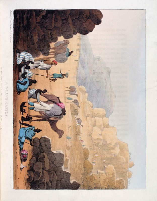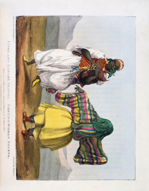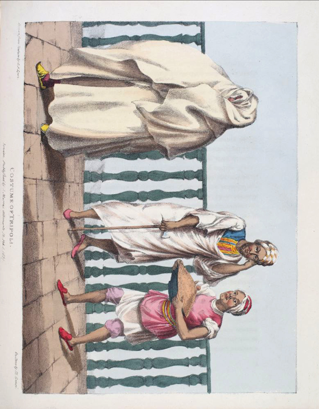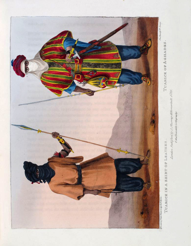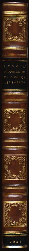 FIRST EDITION. 4to, pp. xii, 383, 17 colour plates, large folding map. A very good copy bound in contemporary calf, panelled in gilt, stamped in blind, neatly re-backed to match. Spine panelled and lettered in gilt, marbled edges, and endpapers. Bookplate to front pastedown of "George Savage Curtis." The author took part in the battle of Algiers in 1816. This work is an account of his journeys, illustrated with plates of sports, costumes, etc. The work was also translated into French. Colour plates in order: 1. Frontis. Costume of Tripoli. (female) 2. Costume of Tripoli. (male) 3. Triumphal Arch. Tripoli. 4. Arabs Exercising. 5. The Castle of Bonjem. 6. A Sand Wind on the Desert. 7. Piper and Dancer, Tripoli / Dancing Woman, Sockna. 8. The Castle of Morzouk. 9. Tuarick in a shirt of leather / Tuarick of Aghades. 10. Tuaricks of Ghraat. 11. Costume of Soudan. 12. Negresses of Soudan. 13. Tibboo Woman in full dress. 14. Tibboo of Gatrone. 15. A Tuarick on his Maherrie. 16. Camel conveying a Bride to her Husband. 17. A Slave Kaffle.