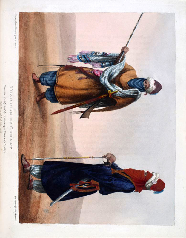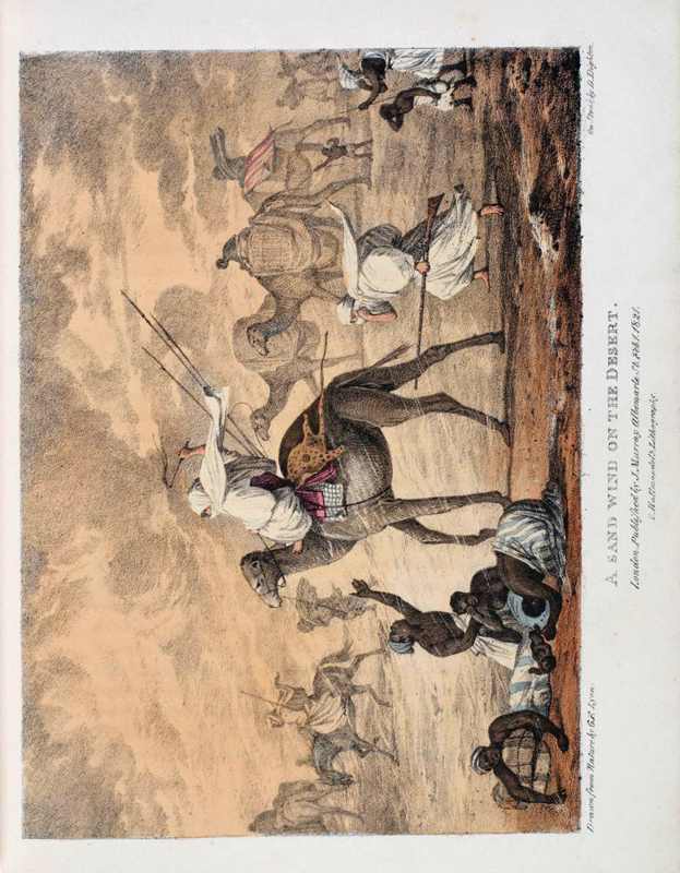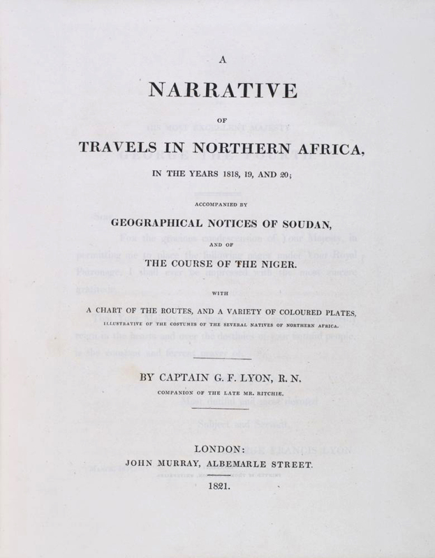 George Francis Lyon was a British naval officer and an explorer of both the Arctic and North Africa. In 1818 he was sent to find the course of the Niger River and the location of Timbuktu. The underfunded and poorly supported expedition left Tripoli and headed off across the Libyan Desert, part of the Sahara. The expedition was generally seen as a failure but his work is a beautifully illustrated account of a little-known area of the world. Lyon took a genuine interest, rare at the time, in the native peoples he saw. Wearing Arab/Muslim dress and learning fluent Arabic he managed to blend in with the inhabitants of North Africa.