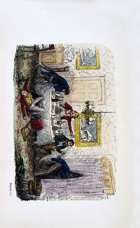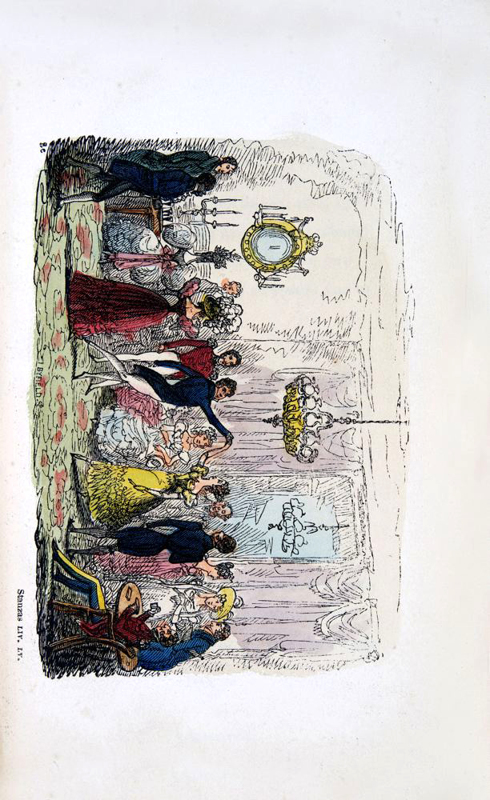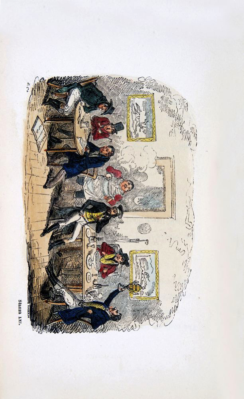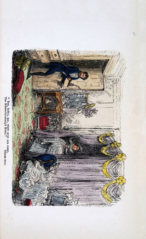 Seven wood engravings by Cruikshank; five hand-coloured with three in duplicate, including both the black and white and coloured versions of the plates. 36pp. very slim 12mo; full red polished calf; paneled in gilt; raised bands; black leather spine labels; decorative gilt compartments; original yellow wrappers bound in top edge gilt; gilt fore-edges; gilt inner dentelles. Both joints neatly repaired edges slightly rubbed. Book label "Ubbelohde" to front pastedown. Coloured plates in order: 1. Frontis. "But ladies, use, when you next come, The Schwartzenburgh Hotel." 2. [Elegant dancing scene.] 3. [A crowd making their way home, from a local event, through driving wind and rain.] 4. [Men at dinner, eating and (over) drinking.] 5. [Men enjoying themselves in a tavern.]
