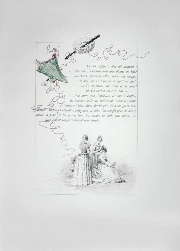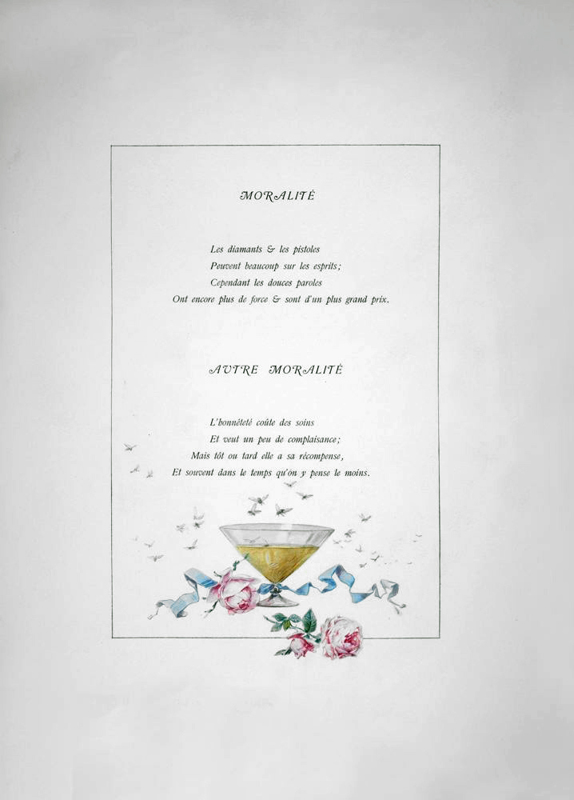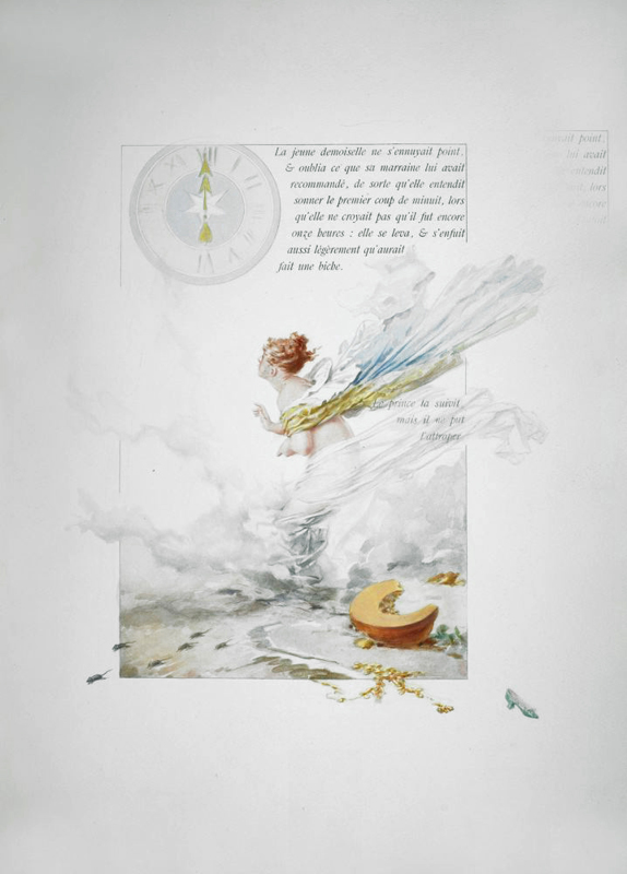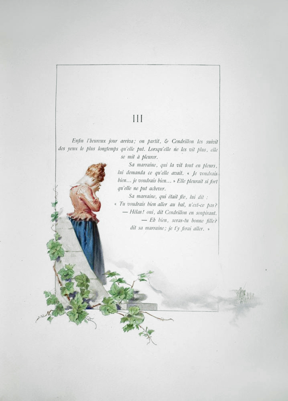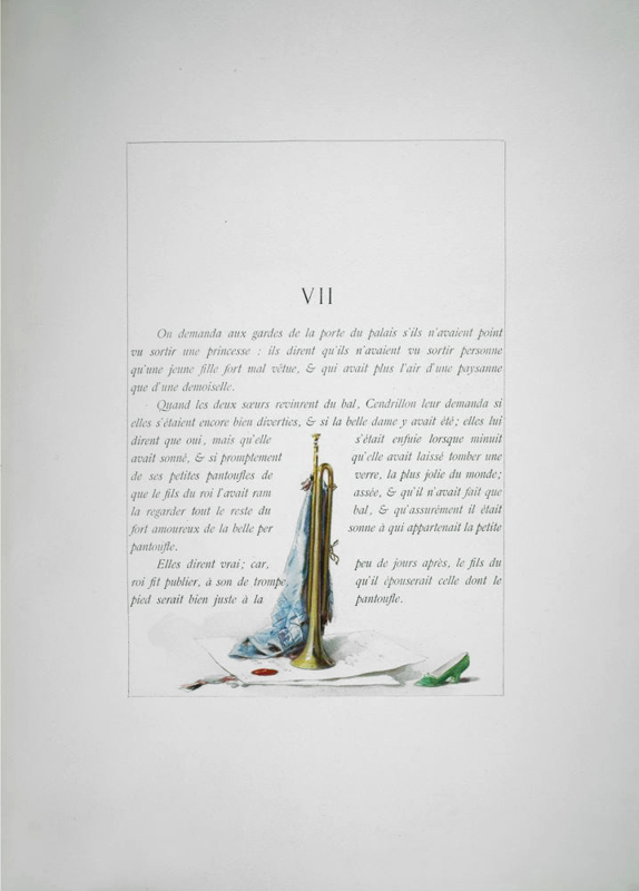 [Cinderella and the Fairies.] 1 of 200 copies only on heavy paper. 32 illustrations (of which 29 are hand-coloured) are printed integrally with the text that reproduces the Edouard de Beaumont watercolours and drawings with astounding fidelity, making them appear original. This copy is inscribed on Christmas from Robert Hoe to his granddaughter: "For Thupza Benson, with affectionate wishes for a Merry Christmas & a Happy New Year from her Grandfather, Robert Hoe. Dec 25th '93". Truly sumptuously bound in full morocco, heavily gilt, blue silk endpapers. Some staining; affects the verso of the front and rear boards, to a lesser extent, the margins of some of the pages. Still, it is a beautiful book with a fine provenance, a family gift from one of America's grandest book collectors. Coloured plates in order: 1. Title page. 2. A Dainty Shoe surrounded by Roses. 3. Melon growing in the ground. 4. Plates, pots, and pans in a kitchen. 5. Maid sitting by a large pot, boiling in a fireplace. 6. Violin and scattered sealed letters. 7. Ladies Corset and Ruff. 8. Young lady with her head in her hands (crying?). 9. Large Pumpkin being carved up. 10. Hand holding a stick / baton by a mouse shown standing on its back legs. 11. Watering can / funnel lying in a garden, with lizards around it. 12. A lady is sitting on a stool with a wand in one hand and a green pair of shoes in the other, talking to a young lady standing before her. 13. A King (?) courting a young lady. 14. Woman holding some citrus fruit. 15. Lady in a green dress waving a wand. 16. King and young lady stand beside an ornate drinking vessel and a plant. 17. Semi-naked lady seen beneath a clock. 18. A flying wheel, a sheet, a glove, and a piece of ribbon. 19. Trumpet, one green shoe, a scarf, and an open document with a red wax seal. 20. Several children's bare and stockinged feet and ankles point towards a green shoe and a Trumpet resting on a plush velvet cushion. 21. Flowers. 22. A lady is wearing a pair of green shoes, resting on a crown. 23. A Glass of Champagne (?), a pair of Frogs, Roses, and a Wand. 24. An Terracotta Wine Jug amongst vines. 25. Roses. 26. Snakes and Frogs. 27. A young lady is startled by a horse and its rider. 28. Snakes and Frog (in the margins). 29. Glass of Champagne, a blue ribbon, and insects.