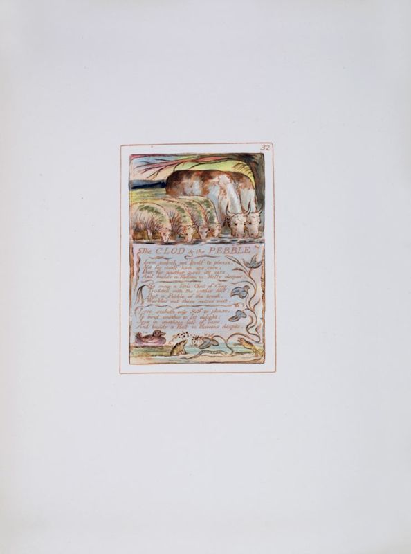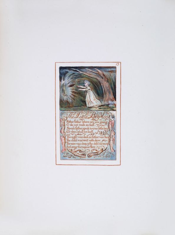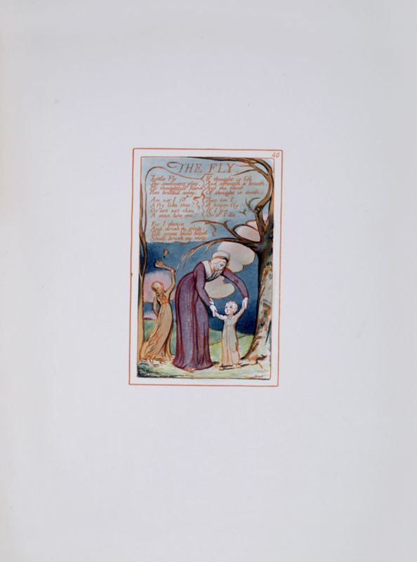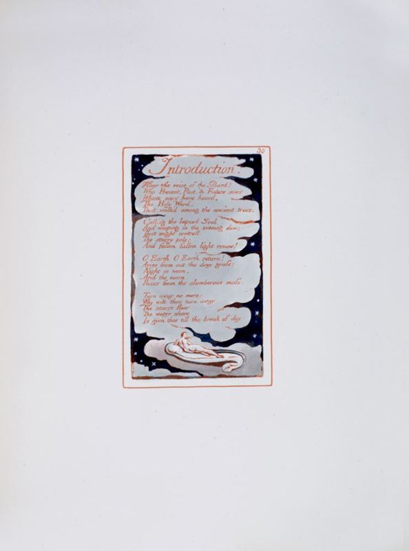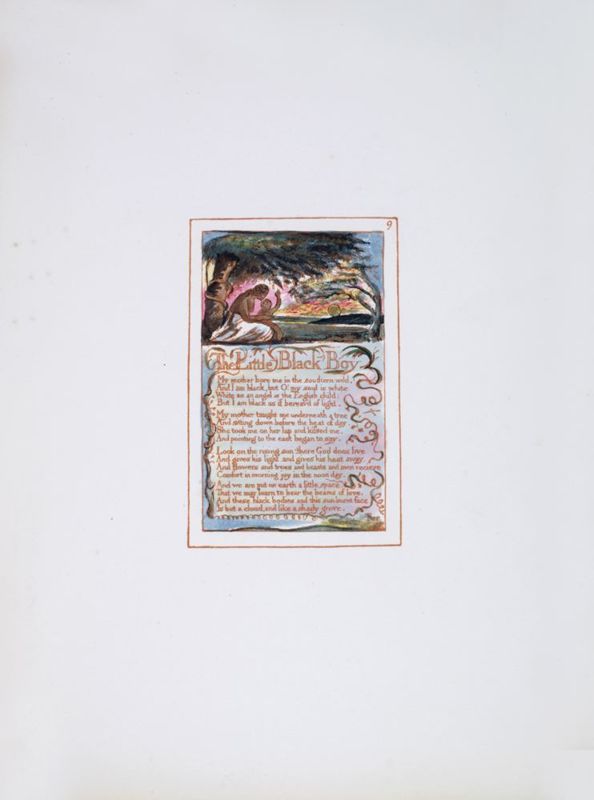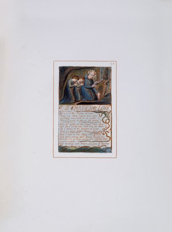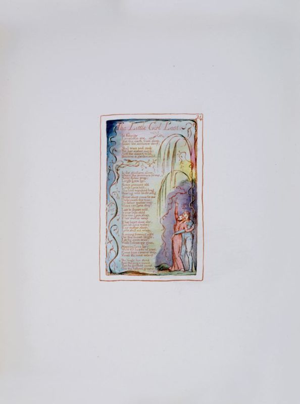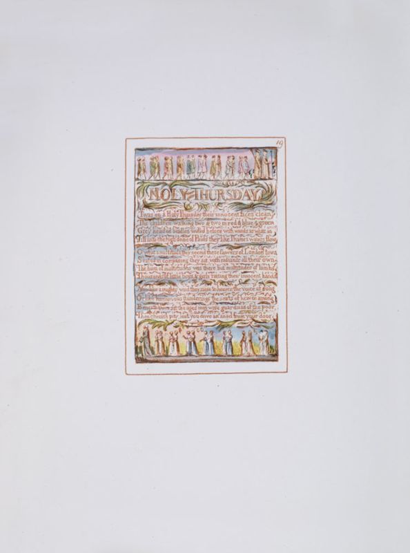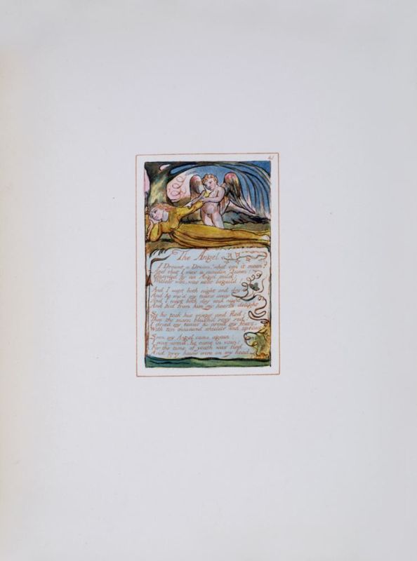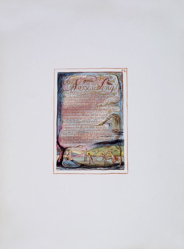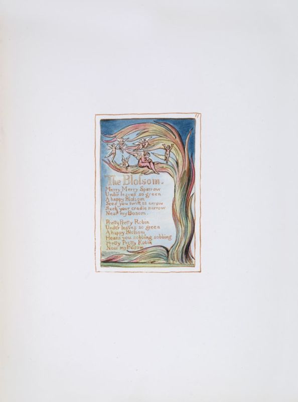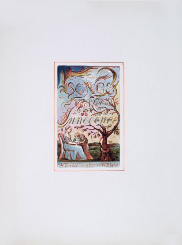 William Blake was an artist, poet, mystic, visionary and radical thinker. Working at a time of great social and political change, his work explores the tensions between the human passions and the repressive nature of social and political conventions. In Songs of Innocence and of Experience, perhaps his most famous collection of poems, he investigates, as he put it in the subtitle, 'the two contrary states of the human soul'. Songs of Innocence and of Experience is regarded as both a visual and literary work of art. Blake invented a new way of printing, designing the work in reverse with varnish on metal plates, which were then etched with acid to produce relief printing surfaces; these were printed in brown ink, and the prints were coloured by hand. Only a small number of copies were made, and sold privately to friends and collectors. (The BL)