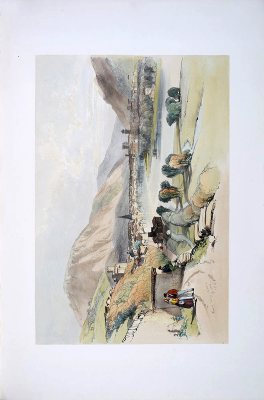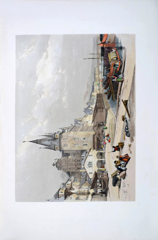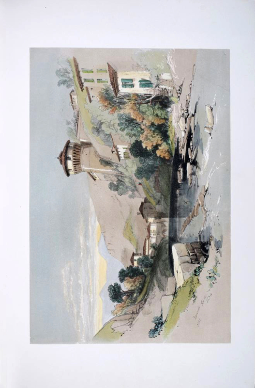 Folio. Publisher’s green half morocco, spine lettered in gilt, purple flower-patterned cloth boards, inner hinges, and yellow end-papers. It lacks the printed dedication leaf. Lithographed title and 50 tinted lithographs on card, all with fine recent hand-colouring. Extremities rubbed, cloth sides evenly sunned, title leaf a little frayed at fore-edge, an excellent copy. MS inscription "Louisa Gladstone from E.F." on front paste-down. FIRST EDITION. “This book represents something of a landmark in the history of the lithograph in that it may be said to initiate the series of tinted lithographs, which ... were to dominate the market for many years, reaching a peak of ambitious bulk in Roberts’s Holy Land, 1842–9” (Abbey). Harding’s work pleased the dedicatee, King Louis Philippe, so much that he presented him with a diamond ring. The plates are of European scenery in Italy, France, Germany, and England. Coloured plates in order: 1. Title page. 2. Vicenza. 3. Bacharach on the Rhine. 4. Chudleigh Rocks, devon. 5. Coblentz. 6. St.Goar on the Rhine / Gastonbell, Tyrol. 7. Falls of Terni. 8. Mayence. 9. Trento. 10. Sistrone, South of France. 11. Coblentz / Neiderslanstein / [illegible] de Sta. Maria del [illegible] / Bacharach. 12. Lyons Church of St. Hezier. 13. Oberlanstein on the Rhine / Riva Lago di Garda. 14. Remains of Holy Island Cathedral. 15. Dijon. 16. Como from the Milan road. 17. Tynemouth, Northumberland. 18. Ruins of Fursternburg with Bacharach in the distance. 19. Bergamo. 20. The Port of London. 21. Finstermetz / Landek. 22. Verona. 23. Shipwreck - a study on the Sussex Coast. 24. Castel Gandolfo & Lake Albano, looking toward Rome. 25. Trento. 26. Hastings. 27. Roveredo. 28. Oberwesel. 29. Desegnsano, Lago di Garda. 30. Roveredo. 31. Peasants of L'Arricia. 32. Dogana & Sta.Maria Maggiore, venice. 33. Ehrensfels from Bingen. 34. Hastings. 35. Naudens. 36. Endsleigh, Devon. 37. Venice, Grand canal. 38. Chateau de St.Pierre - Val d'Aoste. 39. General view of Trento. 40. Frankfort. 41. Bellano. 42. Caub on the Rhine. 43. The Old castle & Bridge at Verona. 44. St.Goar Hausen. 45. Rudesheim. 46. Monaco, Coast of Genoa. 47. Nesso - Lake Como. 48. Chateau Finisso - Val d'Aosta. 49. Greenwich. 50. At Naples. 51. Ruins of Schonberg on the Rhine / Senzadern (?) / Heimbach on the Rhine / Leibenstein & Steinberg on the Rhine.