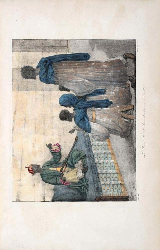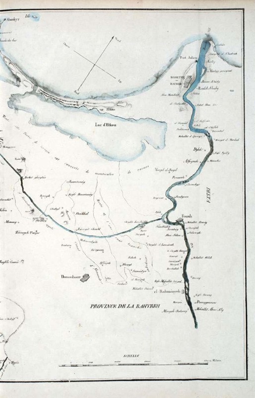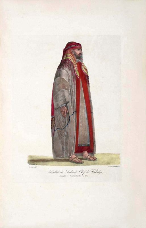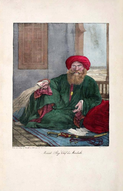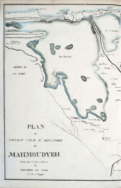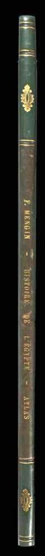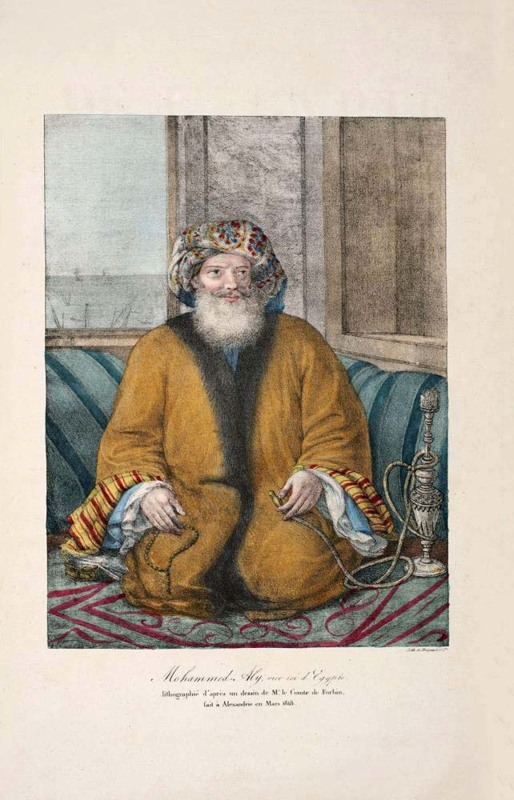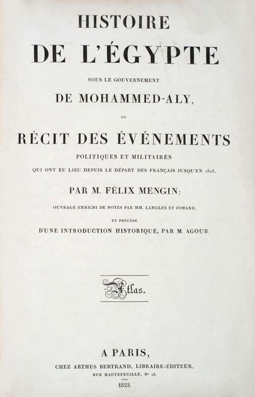 FIRST EDITION. 3 vols, including atlas. Octavo (8 ½ x 5 ¼ inches) – 2 vols & folio (16 x 10 ¼ inches). Green calf-backed boards, spines gilt. Atlas with ten lithographed plates, five hand-coloured and two folding maps, one lithographed & hand-coloured and one engraved. Coloured plates in order: 1. Mohammed-Ali, vice roi d'Egypte. 2. Mourad-Bey, Chef des Mamlouk's. 3. Abdallah-ebn-Souhoud, Chef des Wahabys. 4. Le Roi de Sennair donnant audience a ses ministres. 5. Femme arabe de la tribu des Ababdeh. 6. Plan du Nouveau Canal d'Alexandrie dit Mahmoudyeh (folding).