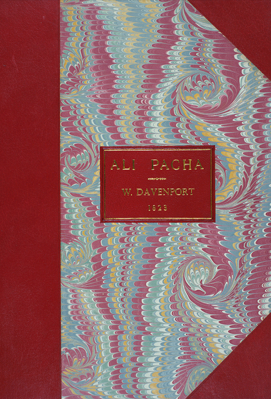 FIRST AND ONLY EDITION. Small folio, 30pp., [2], 6 hand-coloured aquatint plates, engraved by G. Hunt. 20th century 3/4 red morocco, leather label gilt; lettered upper cover, spine raised bands, gilt lettered, gilt edges; marbled boards and endpapers. The text is taken from the English edition of the Life of Ali Pasha by Beauchamp. The author may be connected with the R.A. Davenport, who produced a biography of Ali in 1837 (Atabey). Coloured plates in order: 1. Frontispiece. Ali Pacha, and his brave Officers, resisting the Turkish Generals, sent with the Death-firman to demand the Vizier's Head. 2. The Youthful Ali Bry. Shewn by his Mother to the Partisans and Vassals of his Father's House. 3. Ali Bey discovers the Chest of Treasure near the Ruins of an old Monastery in the Mountains. 4. The Vow of Vengence made by Ali Pacha and his Sister, Chainitza, over the Dead Body of their Mother. 5. The Vizier Ali Pacha, giving the fatal Signal for the Slaughter of the Gardikistes, shut up in the Khan of Valiarie. 6. The Delivery of the Broken Ring to Ali Pacha's faithful Slave, in the Magazine of the Citadel.
