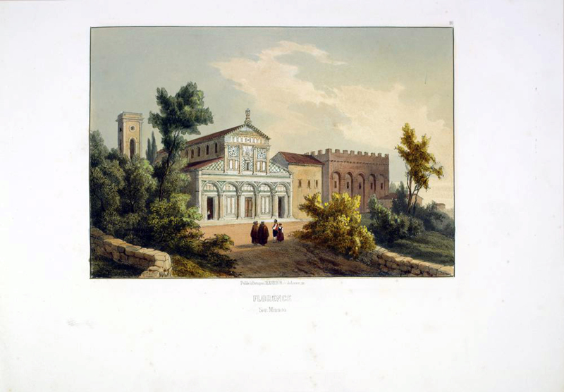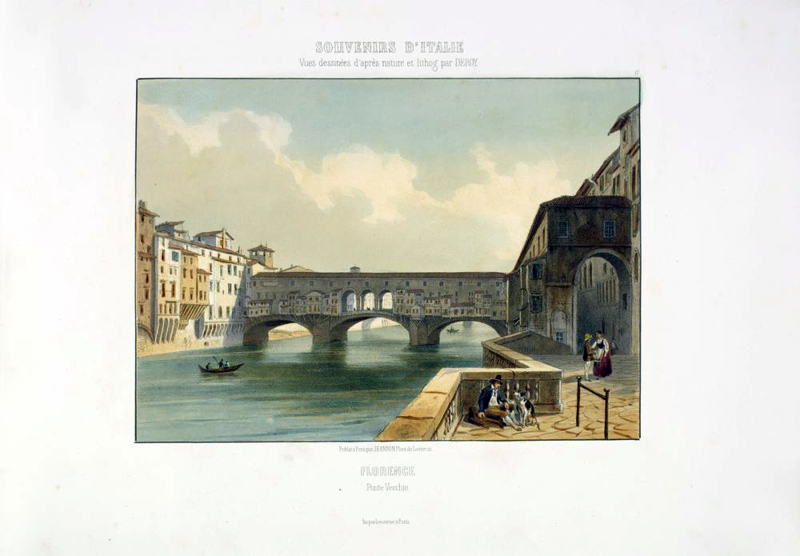 Oblong 8vo. Contemporary half green morocco, spine gilt, sides black morocco with gilt and blind-tooled decoration, blue silk endpapers, gilt-edged. Manuscript in an elegant script, in brown ink, including a calligraphed title and a dedication, interleaved with ten hand-coloured lithographs (Paris, Jeannin) heightened with gum arabic and two hand-coloured engravings, all with views on Florence, Siena, Pisa and surroundings, and one watercolour with a view on Livorno. I-IV, 22 lvs. Delightful manuscript by father Tommaso Pendola (1800-1883), teacher and founder of the 'Royal Institute for the Deaf' ('Instituto Reale Toscano per Sordomuti') at Siena in 1828. The album is dedicated to Paolina Sommi Picenardi (1812-1867), a member of the noble Milanese Verri family who was married to Gerolamo Sommi Picenardi (1801-1863). The noble Sommi Picenardi family resided at the Villa Sommi Picenardi at Lecco near Milan. In excellent condition, 'Officina del Sordo-muti' is lettered in gold on the inside back cover.- (Some leaves are partly loose). Coloured plates in order: 1. Florence. Vue generale prise de San Miniato. 2. Florence. Ste. Marie des Fleurs. 3. Florence. Loge des Lanzi. 4. Florence. Pont de la Trinite. 5. Florence. Ponte Vecchio. 6. Florence. Palais Pitti et Jardin Boboli. 7. Florence. San Miniato. 8. Florence. Vue prise des Cascines. 9. Sienne. 10. Sienne. Fonte Branda. 11. Pisa. 12. Livorno. 13. Prospetto della Gran Conserva degli Arquedotti della Citta di Livorno.