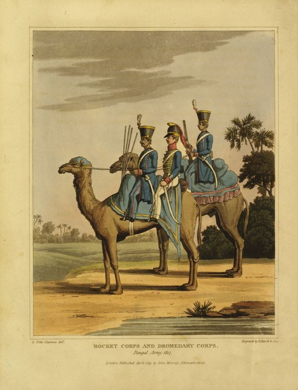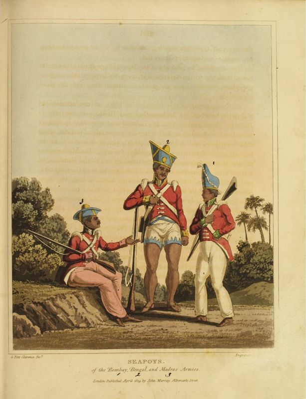 Half leather over marbled boards, spine decorated and lettered in gilt, spine expertly re-backed, repairs to corners, marbled edges, and endpapers. Bookmark of "Robert & Maria Travis" affixed to front pastedown. Contents good. With two maps, one folding, nine hand-coloured aquatint plates by R. Havell & Son, eight engraved plates, and plans. Fitzclarence served in the 24th light dragoons under the command of the Marquis of Hastings in the campaigns against the Mahrattas in 1816-17. When peace was signed with the Maharajah Scindiah, Fitzclarence crossed India with despatches for England. He later became the first Earl of Munster in 1831. MS inscription to prelim. Coloured plates in order: 1. Frontis. Pettah The Citadel, & Pettah of Dowlutabad, a Fortress belonging to the Nizam, near Aurungabad. 2. Map of the Seat of War in India (large folding.) 3. Gorkah Soldier. 4. Hattrass, the Fort of Diub Ram. 5. Rocket Corps and Dromedary Corps. Bengal Army 1817. 6. Irregular Cavalry, Bengal Army 1817. Rhohilla Horse & Skinners Horse. 7. Sketch of the Engagement at Jubbulpoor... (plan). 8. Plan of the City of Nagpoor... (plan). 9. Sketch of the Battle of Meinpoor... (plan). 10. Seapoys of the Bombay, Bengal, and Madras Armies. 11. Sketch of the Engagements near Poonah... (plan). 12. A Khanga on the River Nile. 13. Interior of the Chamber cut in the Rock at the base of the Great Pyramid of Egypt, discovered by Captain Caviglia in 1807. 14. A Sketch of some of the Gold Ornaments worn by the Woman of Timbuctoo.