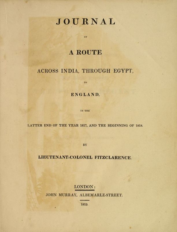 George Fitzclarence (1794-1842), was president of the Royal Asiatic Society and was engaged in the campaigns against the Mahrattas of 1816 and 1817. In this work, he discusses various proposals on the best route between India and England and writes about his remarks on the trade between Persia, Arabia, and India. In February 1818, Fitzclarence returned to England and he explains in this work his observations of Muslim worship, the recruitment of Arabs and Abyssinians in the British army, building vessels for the Imam of Muscat, and his impression of the Island of Socotra, Bab el-Mandeb, the Imam of Muscat, and the best way to fight the Wahhabi Pirates? Fitzclarence, crossed the Egyptian desert, explored the pyramids with Salt And Belzoni, descended the Nile, and reached London via Alexandria and Malta.