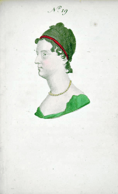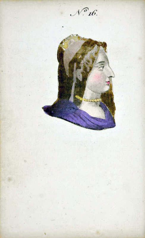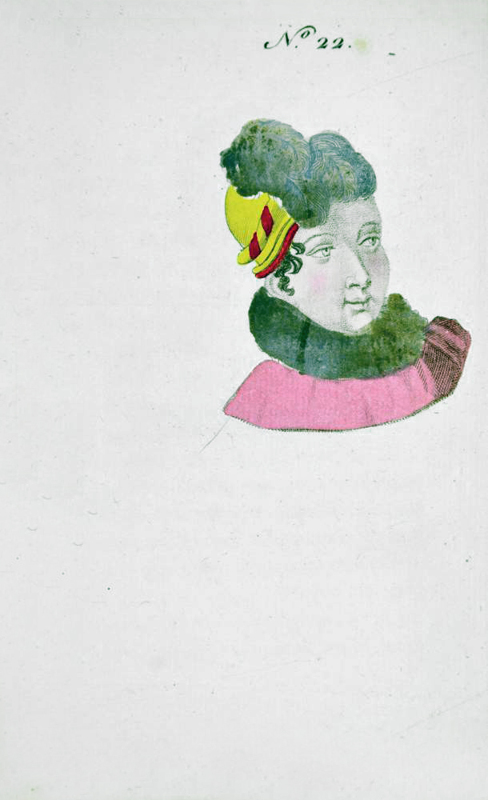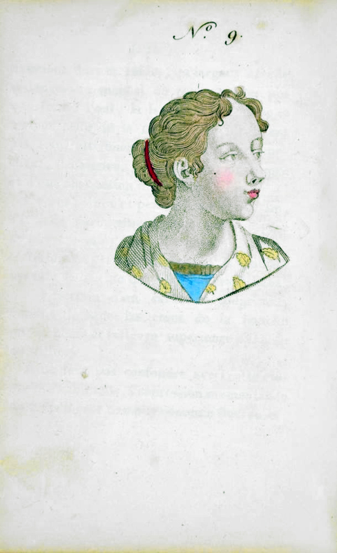 8vo. Contemporary half calf with gilt title on spine with three blind-stamped ornaments, marbled boards. Wear to spine and extremities. With 30 plates, of which 28 coloured by hand. (2), 96 pp. Rare 15th edition of this popular work on how to recognised woman from different countries and cultures by their hair-dress and the shape of their faces. A charming book. Plates are numbered but not captioned. Coloured plates in order: 1. No.12 Lady with hair worn up is facing to the left. 2. No. 3 Lady with her hair under a cap is facing to the right. 3. No. 4 Lady with her hair up is facing straight ahead. 4. No. 5 Lady wearing a veil over her head is facing to the left. 5. No. 6 Lady with a red head band and some hair around her shoulders is facing to the right. 6. No. 7 Lady wearing a brown cap is facing straight ahead. 7. No. 8 Lady with short hair, with a red head band is facing to the left. 8. No. 9 Lady with a pale complexion and light brown hair is facing to the right. 9. No.10 Lady with dark hair is seen facing straight ahead. 10. No.11 Lady with her hair wrapped in a red poka dotted head scarf. 11. No.13 Lady with short brown hair is seen facing to the right. 12. No.14 Lady with her hair wrapped in a pink and green head scarf, facing to the left. 13. No.15 Lady with her hair worn up is seen facing to the left 14. No.16 Lady with a veil worn over her hair, facing to the right. 15. No.17 Lady with her worn up, with a red head band and a mall golden 'crown', facing to the right. 16. No.18 Lady with her hair in a bonnet, tied with a red bow, facing straight ahead. 17. No.19 Lady with a red head band is seen facing to the left. 18. No.20 Lady with her hair under a bonnet, with feathers on top. 19. No.21 Lady with dark curly hair, and a red head band is seen facing straight ahead. 20. No.22 Lady in a yellow and red hat adorned with feathers, facing to the right. 21. No.23 Lady facing straight ahead with her hair in a ping and green head scarf. 22. No.24 Lady with long dark hair, facing to the right. 23. No.25 Young Lady with long dark hair down to her shoulders, facing to the left. 24. No.26 Older lady with her curly hair peeping out from under a hat, facing to the right. 25. No.27 Lady with her hair worn up, with a red head band looking straight ahead. 26. No.28 Young lady looking down with her hair tied in blue ribbon. 27. No.29 Lady in what appears to be a fur hat with chin strap. 28. No.30 Lady in a yellow and red dress with her hair worn up, looking to the right.