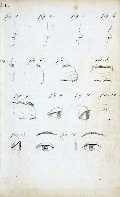 Adapted from Lavater's four-volume 'Physiognomische Fragmente zur Beförderung der Menschenkenntnis und Menschenliebe', first published in Leipzig between 1775 and 1778, then translated into French and English. A Swiss pastor and friend of Goethe and the painter Henry Fuseli, Lavater introduced the idea that physiognomy related to specific character traits of individuals (rather than general types, as the ancients believed), and that a person's character could be elucidated through examining his or her "lines of countenance." He based his ideas on those of the Italian polymath Giambattista della Porta and Sir Thomas Browne's Religio Medici.