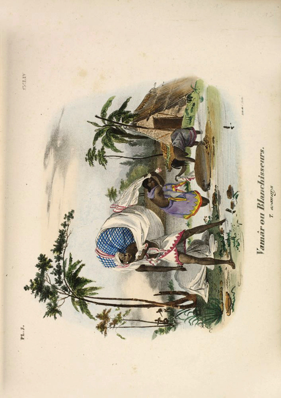 [French India or Collection of images Representing Divinities, Temples, Furniture, Arms Ornaments, Utensils, Religious Ceremonies and Scenes of Private Life] Folio. Contemporary half red morocco, title to spine in gilt, with raised bands - Lower board ruled in blind, the upper board ruled in blind, and title tooled in gilt. All edges gilt. Twenty-four lithographed plates, all beautifully coloured by hand. A beautiful set. Designed by Le Beau, Midy, Geringer, and others and lithographed by Marlet, Motte, and Racinet. 24 leaves with text. A rare set of hand-coloured lithographs illustrating daily life, costumes, divinities, temples, and other scenes of India during the first half of the 19th century. The work was published in installments, and around 1838, we know of a "finished" set of 144 lithographs, but not coloured as per the earlier issue. Coloured plates in order: 1. Mannarsouvami. 2. Sypaye, Soldat Indien au Batalion Francais de Pondichery. 3. Vieille femme de haute Caste. 4. Ram - Mohan - Roy. 5. Milton. 6. Nirriti. 7. Dirgha, epouse de Nirriti. 8. Kouvera Dieu des Richesses. 9. Tchitralekha, epouse de Kouvera. 10. Yama, Dieu des Regions Inferieures. 11. Parashouramah. 12. Katavarayen. 13. Vamar ou Blanchisseurs. 14. Veuves Indiennes. 15. Pariah Combou - cara, tromette. 16. Vie prise dans le Tinnevely. 17. Djitty. 18. Vaishya, Marchand. 19. Fauconnier. 20. Mahrattes. 21. Tisserands. 22. Pandarons ou Religieux mendiant, de la Caste de Vichnou. 23. Brahmane Maitre d'Ecole. 24. Musiciens.