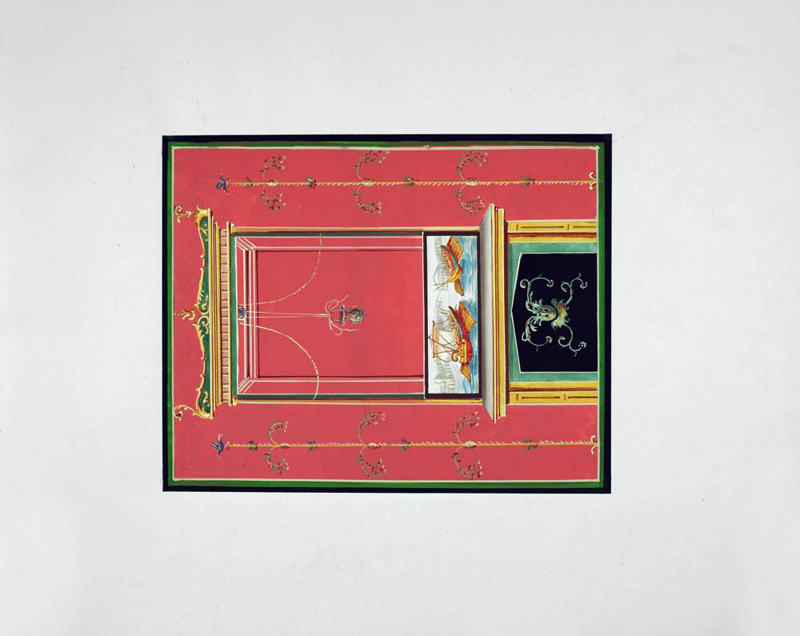 Beautiful vivid prints of ancient fresco walls and mosaics excavated at Pompeii. In the age before photographic color images, drawings, prints and paintings of frescoes served as souvenirs for the great libraries of Grand Tour travelers and patrons and provided inspiration to neoclassical architects and decorative art designers.