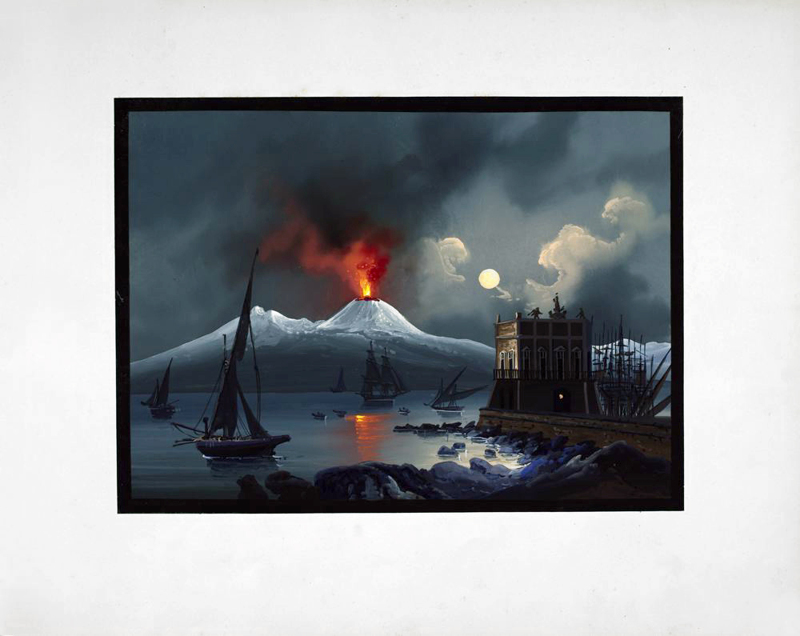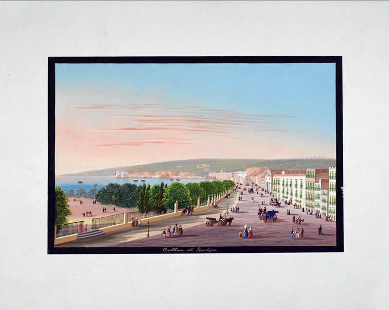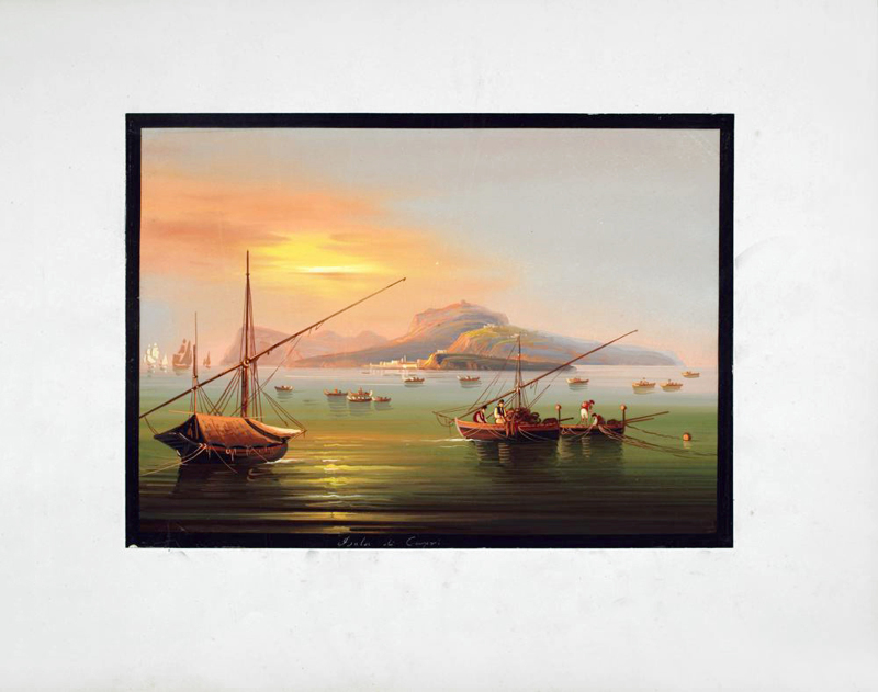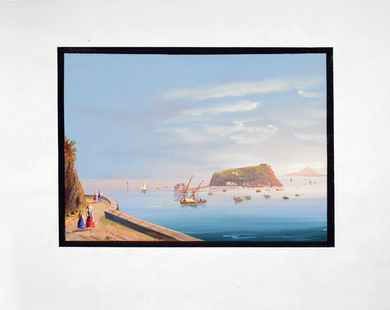 Un volume in-4 oblong ; percaline d’éditeur bleue, titre en lettres dorées au plat supérieur, tranches dorées. 19 planches parmi lesquelles 17 magnifiques gouaches napolitaines représentant des fresques de Pompéi (7) et des vues de Naples et ses environs (12). An oblong quarto volume; blue editor's percaline, title in gilt letters on the upper cover, gilt edges. Nineteen plates, including seventeen magnificent Neapolitan gouaches representing frescoes from Pompeii (7) and views of Naples and its surroundings (12).Beautifully illustrated and with fresh, vibrant colouration. Marbled endpapers, with original tissue guards for each plate. Spine showing signs of rubbing and wear, else in excellent condition. Coloured plates in order: 1. Pompei - Mosaisque (black dog on a lead). 2. Pompei - Peintures. (three ladies with three winged cherubs, one in a cage). 3. [Not captioned] Fresco of a decorative interior wall. 4. [Not captioned] Fresco of a wall above a mantlepiece. 5. [Not captioned] Small piece of a fresco. 6. [Not captioned] As above. 7. [Not captioned] As above. 8. Collina di Posillipo. 9. Napoli dal Campo. 10. Napoli da Mare (night scene). 11. [Not captioned] Night scene of Bay of Naples and the volcano of Mount Vesuvius erupting. 12. Sorrento. 13. Isola di Capri. 14. Isola d'Ishia. 15. Isola di Procida. 16. [Not captioned] Beautiful view of villas and shoreline of Bay of Naples. 17. [Not captioned] Beautiful view of one of the islands in the Bay of Naples. 18. Grotto Azzurra (night scene). 19. Grotto di Pozzuoli (?)