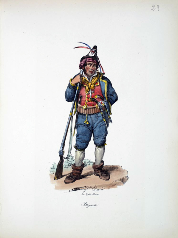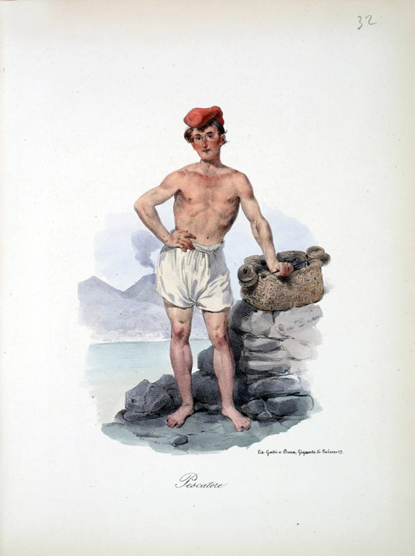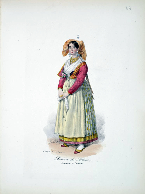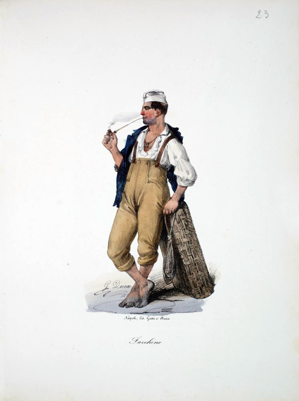 [New collection of costumes and clothing of Naples and its surroundings] 4to., (12 x 9 inches). Gold printed title page. Fifty-five fine hand-coloured lithographed plates after Dura dated between 1833 and 1853. Contemporary red roan-backed red paper boards (extremities a little scuffed). Provenance: with the contemporary MS ownership inscription of Samuel Hammond of Naples, dated 1853, on the front free endpaper; the 20th-century bookplate of Julia and Arthur Slepian on the front paste-down. Coloured plates in order: 1. Coloured title page. 2. La casa di Pulcinella. 3. Zampognaro che fa ballarei birattini. 4. Il Trovatore. 5. La scopritore della Grotta Azzurra a Capri. 6. Donna di Sorrento. 7. Sorbettaro anbulante. 8. Scrivano. 9. Pritorno della Madonna dell Arco (female). 10. As above (male). 11. Donna di Procida. 12. Pescivendolo. 13. Venditrice di pollanchelle. 14. Pizzajuolo. 15. Venditrice di ouva. 16. Nutrice. 17. Venditrice di Mussolino. 18. Marinaro. 19. Donna di Ischia. 20. Lazzarone. 21. Mangia maccheroni. 22. Fragolaro. 23. Facchino che dorme. 24. Facchino. 25. L'educazione. 26. Cambiamonete. 27. Donna di Capri. 28. Donna di Chiaia. 29. Contadino. 30. Brigante. 31. Spaccone, Guappo Napolitano. 32. Lavandaja. 33. Pescatore. 34. Donna di Arienzo, vicinanze di Caserta. 35. Acquajuolo. 36. Questuante per S. Antonio Abbate. 37. Tarantella (male). 38. Tarantella (female). 39. Banditore di vino nuovo. 40. Venditrice di Castagne bollite della allesse. 41. Acquavitajo. 42. [Vegetable Seller - female]. 43. Il Ciabattino. 44. Vemditrice di acqua solfurea. 45. Catagnaro. 46. Carrafaro. 47. Venditore di fichi freschi. 48. Marinaro. 49. Pescatore e Pescivendolo. 50. Venditrice di polpi colli. 51. Venditore di polmone cotto per i gatti. 52. Tamburraro. 53. Tarallaro. 54. Lo Zingano. 55. Sampognaro. 56. Minestrajo. Venditore di vendume.