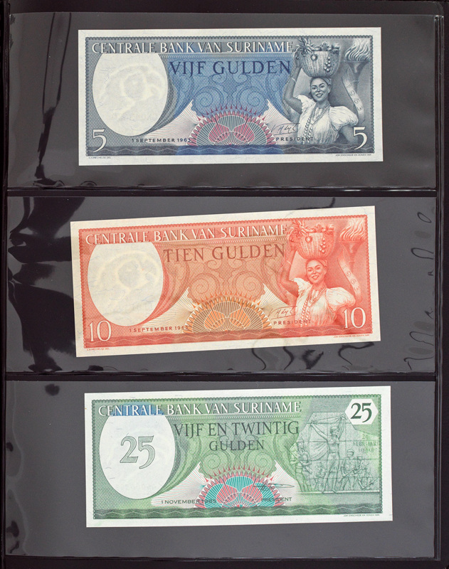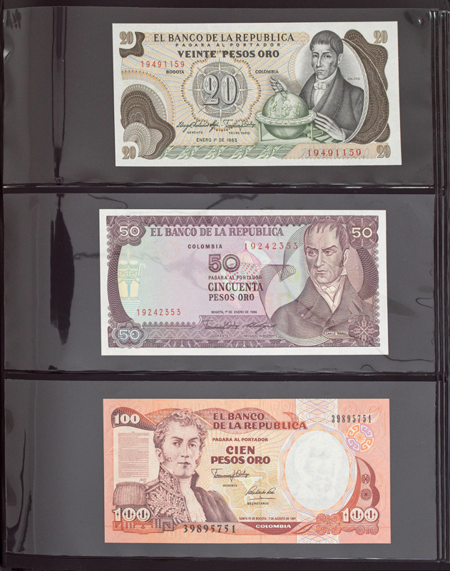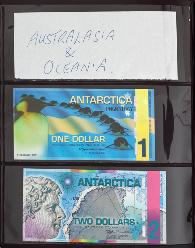 A fascinating and interesting bank note album presented in a black folder with gilt title lettering in English and Chinese, plus a decorative design to the front cover. Ruled in gilt to spine. Each note is housed in a separate plastic wallet. The second of two bank note albums - this album covers South America, Australasia, Oceania. All notes are in good to very good condition. Countries covered are: 1. Argentinian Peso 2. Brazilian Real / Cruzeiros 3. Colombian Peso 4. Ecuadorian Sucres 5. Guyanese Dollar 6. Paraguayan Guarani 7. Peruvian Inti 8. Surinamese Guilder 9. Venezuelan Bolivar 10. Antarctic Dollar 11. Australian Dollar 12. French Polynesian Franc 13. New Zealand Dollar