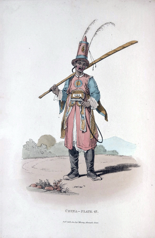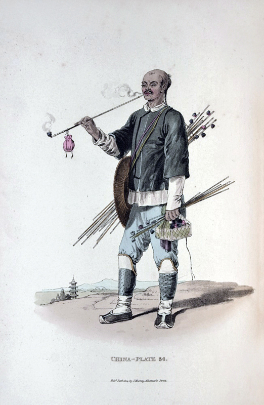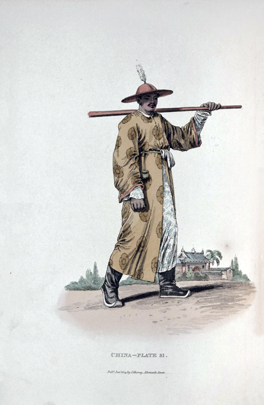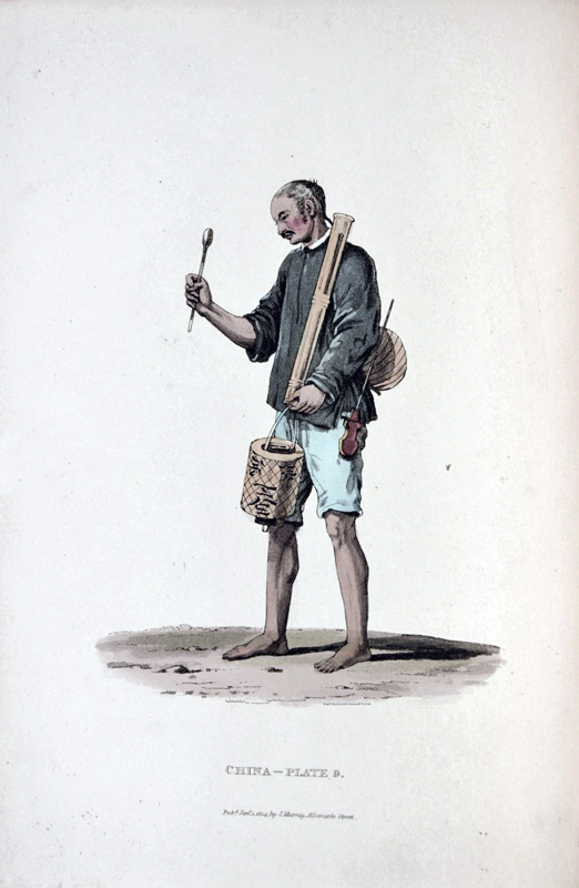 The beautiful colour plates depict the dress of the Chinese people which shows amongst others, various trade people. William Alexander was the official Artist of Lord Macartney's embassy. At the close of the 18th century, England was “anxious to establish formal diplomatic relations with China and thus open the way for unimpeded trade relations. But the pall of Chinese reserve and self-sufficiency, which for many centuries seldom admitted penetration, still hung over this empire” (Cox I, 344). In 1792, a mission to Beijing was led by Lord Macartney, designed to establish diplomatic relations, but the Chinese “effectually resisted Macartney’s arguments and gifts… His visit was not in vain, however, for it gave us a most interesting account of Chinese manners and customs” (Cox).
