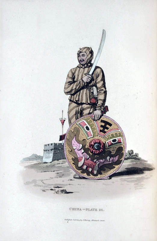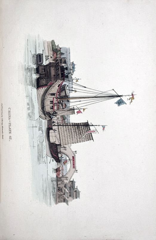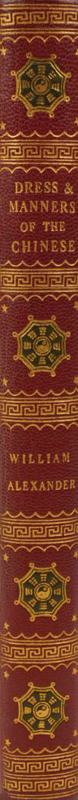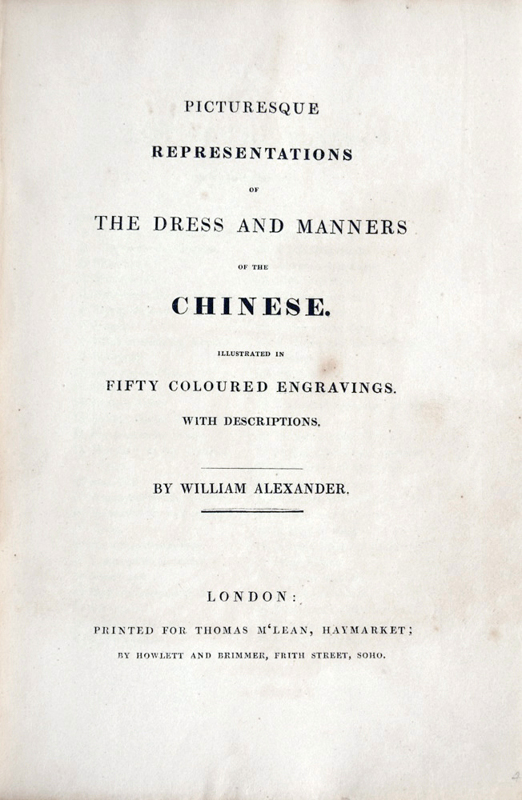 1pp (title) + 1pp (list of plates) + 50 leaves of descriptive text facing 50 contemporary hand-coloured engraved plates. Exquisitely bound by Courtland Benson in a thematic period-style burgundy morocco, with elaborate Greek-key patterned borders to boards; black on-lays with the "Yin and Yang" symbol; ornate gilt inner dentelles; marbled endpapers. An untrimmed, wide-margined copy, clean and crisp; near fine. Alexander went to China in 1792 as a draughtsman with the Earl of Macartney's embassy to the Emperor of China. His first-hand observations are reflected in the finely-executed illustrations of the costume and dress of the Chinese people, which showcase the different classes and occupations of the people encountered. Portrayals include the Emperor and his servants, fishermen, state officials, priests, vendors, soldiers, labourers, musicians, entertainers, and tradesmen. The engravings are by John Murray and dated 1814 but are printed on paper watermarked "1827." Murray, the original publisher, sold the printing plates to Thomas M'Lean in about 1818, who then republished the book at some later date. Coloured plates in order: 1. Frontis. Kien Lung, the Emperor. 2. Title page. A Stand of Arms. 3. Fishermen and their Cormorants. 4. A Man Servant. 5. Mandarin in his Court Dress. 6. An Offering in the Temple by a Young Bonzee. 7. A Juggler. 8. Children collecting Manure. 9. A Watchman. 10. A Lady and her Son. 11. A Bonzee. 12. A Vendor of Lanterns. 13. A Soldier with his Matchlock. 14. A Porter is carrying Goods. 15. A Mandarin in his Common Dress. 16. A Boat Girl. 17. An ordinary Sedan Chair. 18. A Mandarin's Servant on Horseback. 19. An itinerant Musician. 20. An Officer of the Corps of Bowman with Ensign. 21. A Chinese Mendicant. 22. Chinese Barbers Champooing etc. 23. A Bookseller. 24. A Soldier of Infantry. 25. A Raree Show. 26. A Mandarin's Page. 27. A travelling Smith. 28. Mourners at the Tomb of a Relation. 29. A Vendor of Rice. 30. A Female Comedian. 31. A Sedan Bearer. 32. A man is selling Betel, etc. 33. Horse and Cart with Driver. 34. A Seller of Pipes. 35. A Waterman in his Barge. 36. Tradesman with his Swan-pan. 37. Women peasants winding Cotton. 38. A Tartar Dragoon Soldier of the Cavalry mounted. 39. Punishment of the Tcha, or Cangue. 40. Group of Children eating their meal. 41. A Sedan Chair. 42. Vessels on the Great Canal. 43. A Chinese Lady of Rank. 44. Nursery Maid and her two children. 45. A Stage Player. 46. Group of Trackers Regaling. 47. Mandarin's Officer. 48. Punishment for Insolence to a Superior (the Arrow punishment.) 49. Woman selling Chow-Chow. 50. Group of Soldiers.