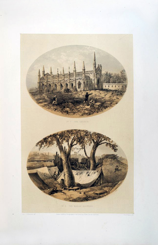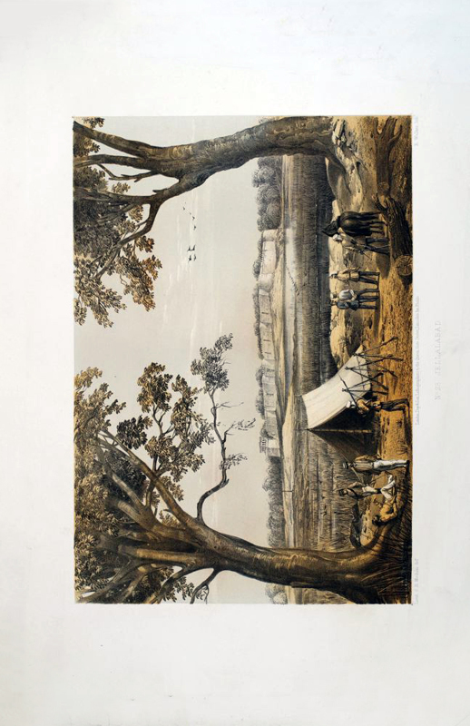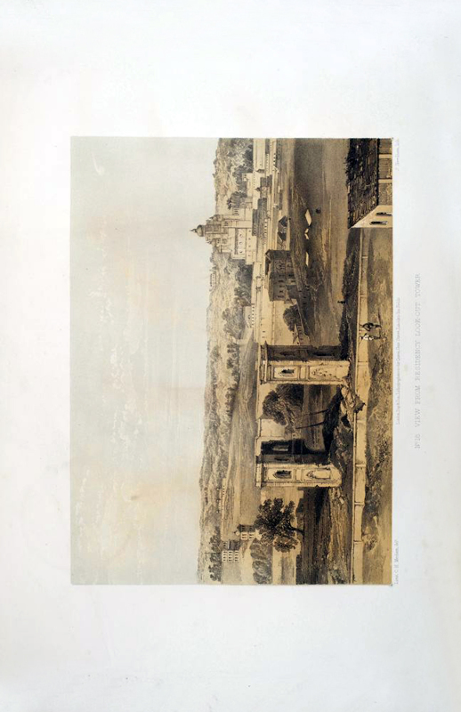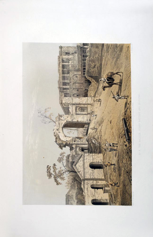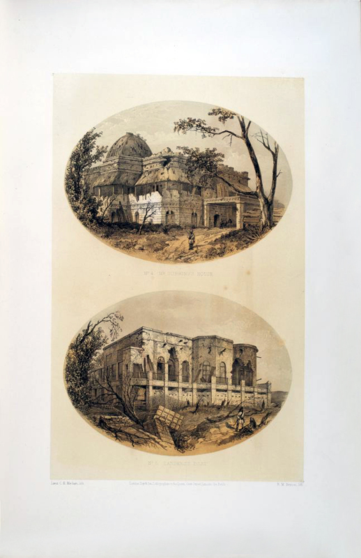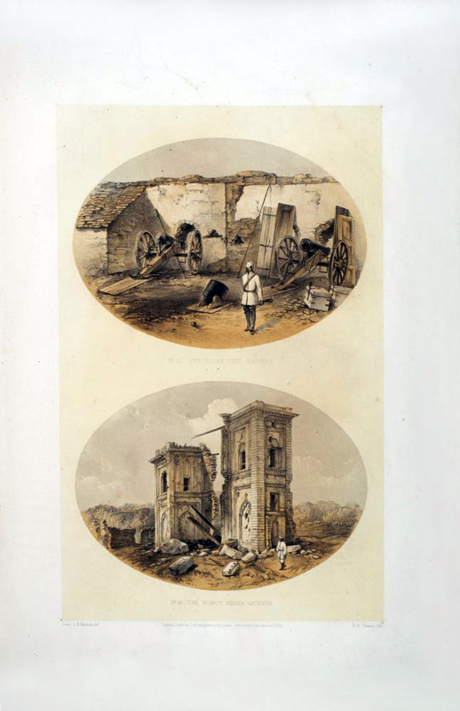 Ten p: 27 tinted lithographic plates on 18 leaves, Large Folio. Publisher's red cloth-covered boards, tooled in blind and title embossed in gilt, boards soiled, worn, and faded. The spine is re-backed. Some foxing, some plates with margins chipped and repaired. An eye-witness report of the siege of Lucknow, describing and depicting the heavy toll suffered by the British. Not in the usual bibliographies. Coloured plates in order: 1. Title page. Baillie Guard Gateway. 2. The Baillie Guard Gateway from the Nobut Khana (Music Hall.) 3. The Residency from the Water Gate. 4. Mr. Gubbins's House. 5. Sander's Post. 6. Front view of the Residency. 7. The Church. 8. The Redan Battery. 9. The Baillie Guard Battery and Hospital. 10. The New Cawnpore Battery. 11. The Judicial Commissioners' Kutchery (Court House.) 12. Rear view of the Residency from the Churchyard. 13. The Seikh Yard Breach. 14. Interior of the Residency Billiard Room. 15. View from Residency Look Out Tower. 16. The Seikh Yard Battery. 17. The Nobut Khana Gateway. 18. The Clock Tower Gateway. 19. View from the Highlanders' Post. 20. Anderson's Battery. 21. Havelock's Grave and the Alumbagh Picket-House. 22. Interior of Alumbagh. 23. Jellalabad. 24. Listening for Miners. 25. The Mosque Picket. 26. Lying in Wait. 27. Sinking a Shaft.