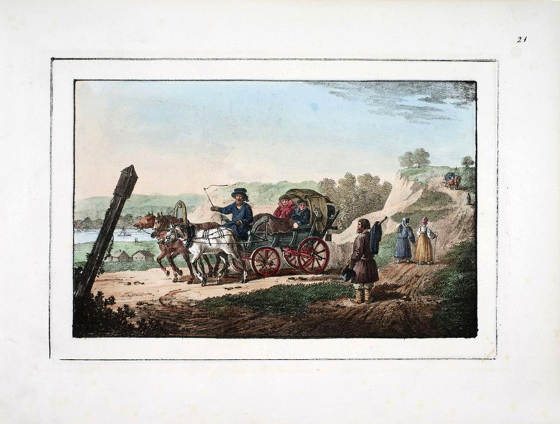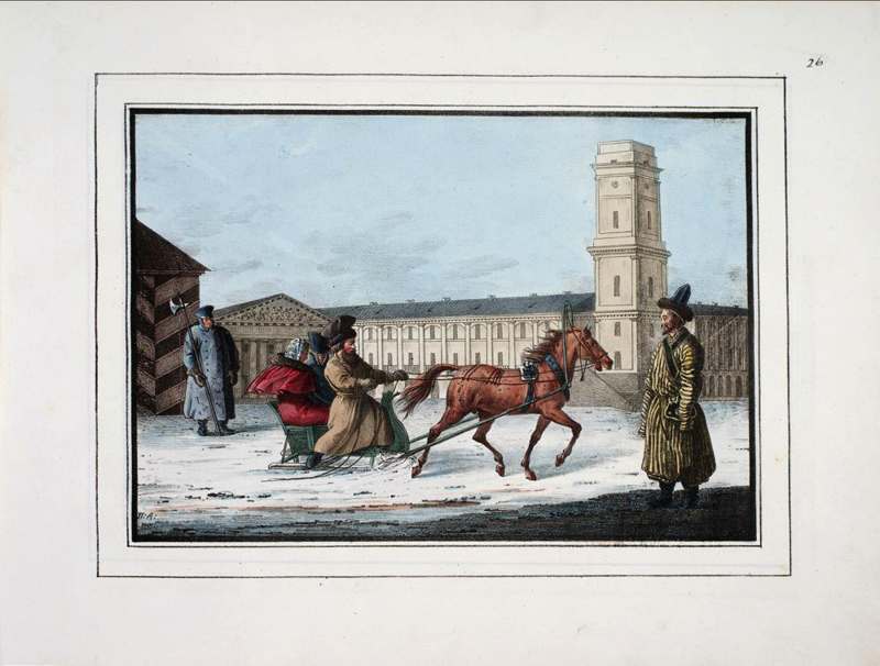 Oblong quarto (10 x 13 inches), fresh red morocco back and marbled boards, original round paper label on upper board. The boards and spine are fresh with gilt and black title label. Some light foxing throughout. Thirty-eight hand-coloured lithographic plates, plus a title vignette. MS signature of 'Madame Ch. Vaucher 1832' on title page. Coloured plates in order: 1. Vue de l'Amiraute imperiale et de son Boulevard, a St. Petersbourg. 2. Vue de la Bourse, a Vassili-Ostroff. 3. L'Empereur Alexandre I a Ochta, trait historique. 4. Un Traineau de ville, a 2 chevaux, d'apres Mr. A. Orlowski. 5. Un Drochki de Seigneur, a 2 chevaux, d'apres Mr. A. Orlowski. 6. Traineaux charges de Glacons de la Neva. 7. Un Marchand de bois a bruler, sur un Rospouski d'apres Mr. A. Orlowski. 8. Un portefaix transportant des sacs de farine, en hiver. 9. Un Feldjager portant des Depeches officielles, en ete. 10. Interieur d'un Cabaret pour les Cochers, costumes d'hiver. 11. Traineaux de louage, Marchand de Poissons, etc. 12. Cochers, Marchand de pains, de Blinis, etc. 13. Vue de la Colonnade de Cameron, a Tscarcoe-Selo. 14. Des voyageurs dejeunant a un Relais de poste, en ete. 15. Drochki de ville, a un cheval. 16. Vue pittoresque d'un village russe, en hiver. 17. Fete et Danse villageoises, en ete. 18. Le Marche aux Cochons geles, d'apres A. Orlowski. 19. Vue du port de Cronstadt. 20. Des Postillons revenant d'une poste sur leurs chevaux. 21. Voyageurs en Britchka, a 3 chevaux, en ete. 22. Courrier extraordinaire, a 3 chevaux, d'apres A. Orlowski. 23. Voyageurs en Kibitka, grand traineau, a 3 chevaux d'apres A. Orlowski. 24. Telegue d'ete, a 3 chevaux, d'apres Swebach. 25. Drochki bourgeois, a 2 chevaux,d'apres Swebach. 26. Un traineau a un cheval, par M. Fremy. 27. Petite Restauration ambulelante, et Boutique de Tabac. 28. Voiturier rafraichissant son cheval. 29. Voiturier en route transportant des Marchandises. 30. Chariot attele de 6 chevaux, pour transporter le Granit. 31. Balancoire et Jeux de jeunes villageoises. 32. Landau a 4 chevaux, par Desarnod. 33. Une Voiture finoise cassee. 34. Traineau de famille, a 3 chevaux. 35. Traineau bourgeois a 2 chevaux. 36. L'Isvoschtchik et le Bouteschnik. 37. Un Finois avec sa Fille en charette, allant au marche. 38. Des Balnchisseuses sue la glace, en hiver.