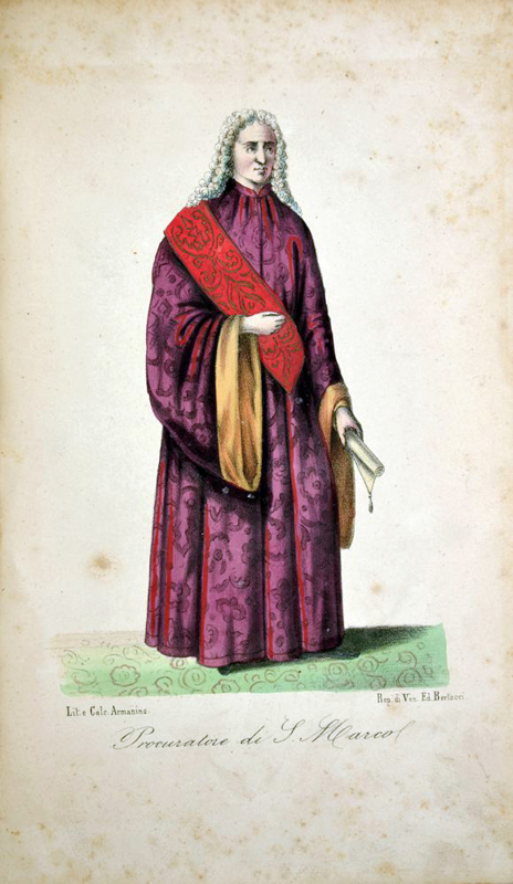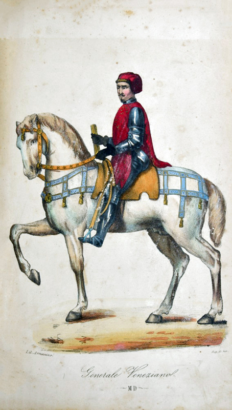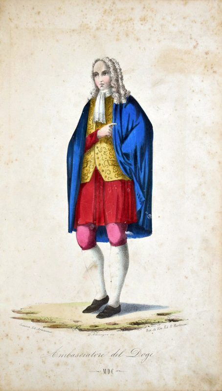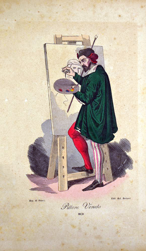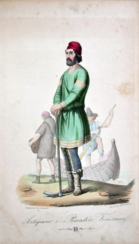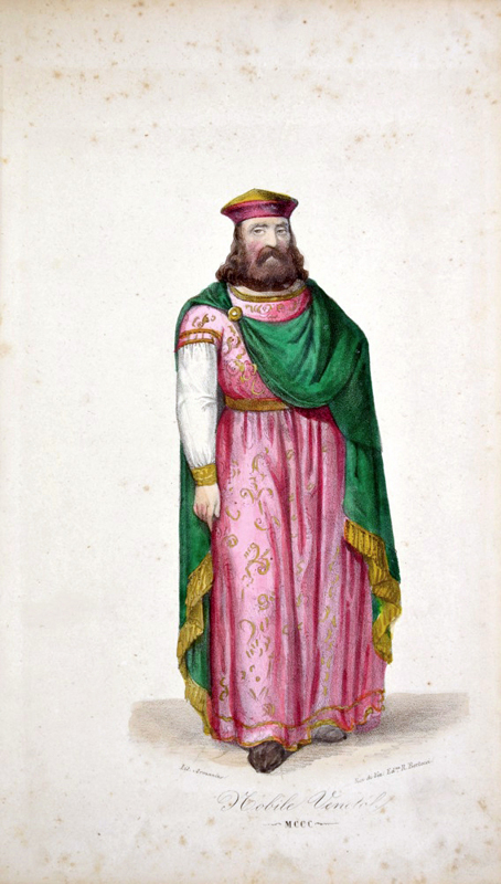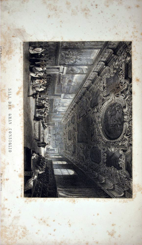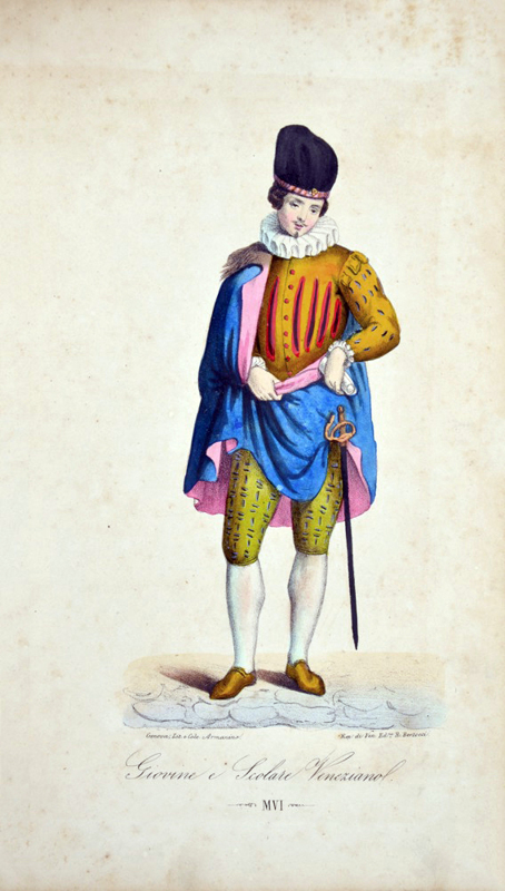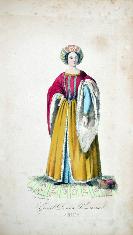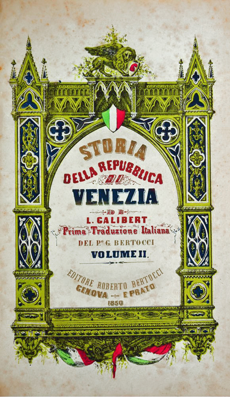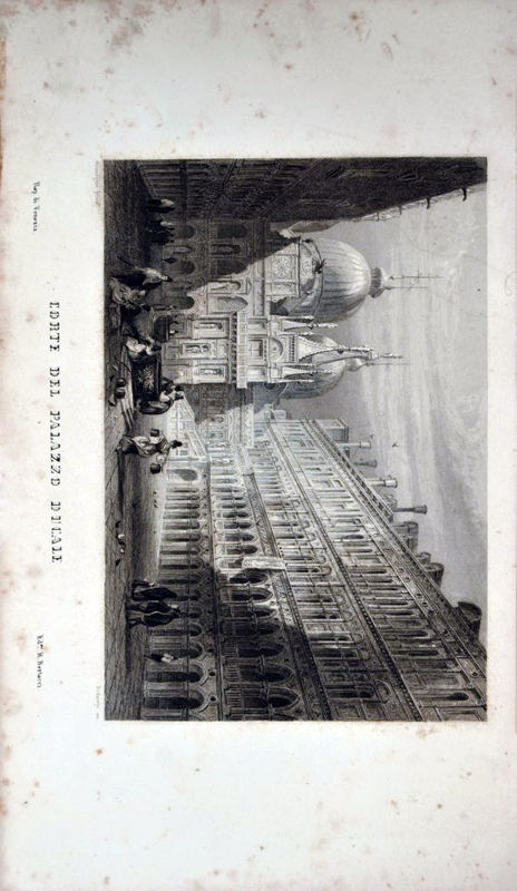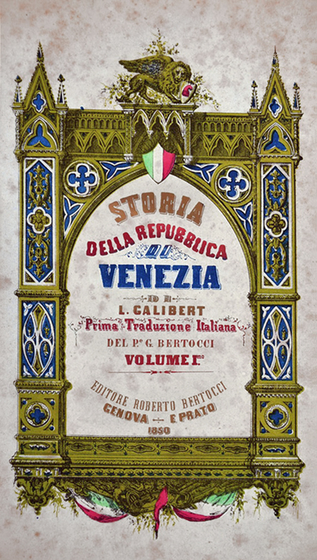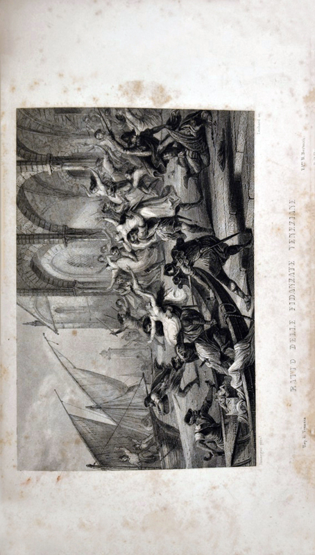 2 vols. in 4to; frontespizio figurato a colori, 501 pp., 3 cc., 16 tavv. litografiche di costumi a colori e 4 in acciaio di vedute; frontespizio figurato a colori, 359 pp., 9 tavv. litografiche di costumi, 3 in acciaio con edifici e una grande veduta di Venezia a volo d'uccello; legatura del tempo in mezza pelle.Titoli e fregi in oro al dorso (minimi difetti alle cuffie). Seconda tiratura, tipograficamente assai migliorata, della prima traduzione. History of the Republic of Venice. Quarter leather over red speckled paper boards; flat bands in gilt to spine; title in gilt to spine; coloured edges; spine pulled; hinges rubbed and worn; corners have been repaired; bookplate to front pastedown reads: "Ex Libris Dio Mi Concesse Questi Ozi." 2 x coloured title pages, 2nd edition, 27 col costume plates and eight uncoloured steel engraved plates....including a lovely double-page view of Venice together with some wood-engraved illustrations in the text. Coloured plates in order: Volume 1. 1. Title page. 2. Nobile Veneziana. 3. Ambasciatore del Doge. 4. Giovani e Scolare Veneziano. 5. Gentil Donna Veneziana. 6. Mercante Veneto. 7. Nobile Venuto. 8. Dogaressa di Venezia. 9. Guerrieri Veneziani. 10. Artigiano e Pecatori Veneziani. 11. Soldato dei rifuggiti sui Lidi Veniti. 12. Contadina di Belluno. 13. Senatore. 14. Contadino Veneto. 15. Cav di San Marco. 16. Generale Veneziano. 17. Doge di Venezia. Volume 2. 18. Title page. 19. Donna del Popolo. 20. Procuratore di San marco. 21. Alabardiere e suo Capitano. 22. Contrabbandiere Veneto. 23. Pittore Veneto. 24. Gentildonna di Brescia. 25. Rettore dello Studio di Padua. 26. Soldato della Marina Veneta. 27. Cancelliere Grande.