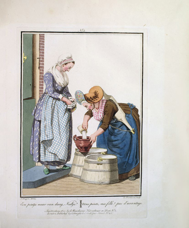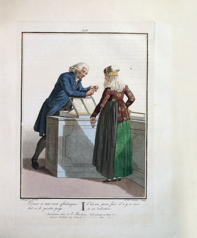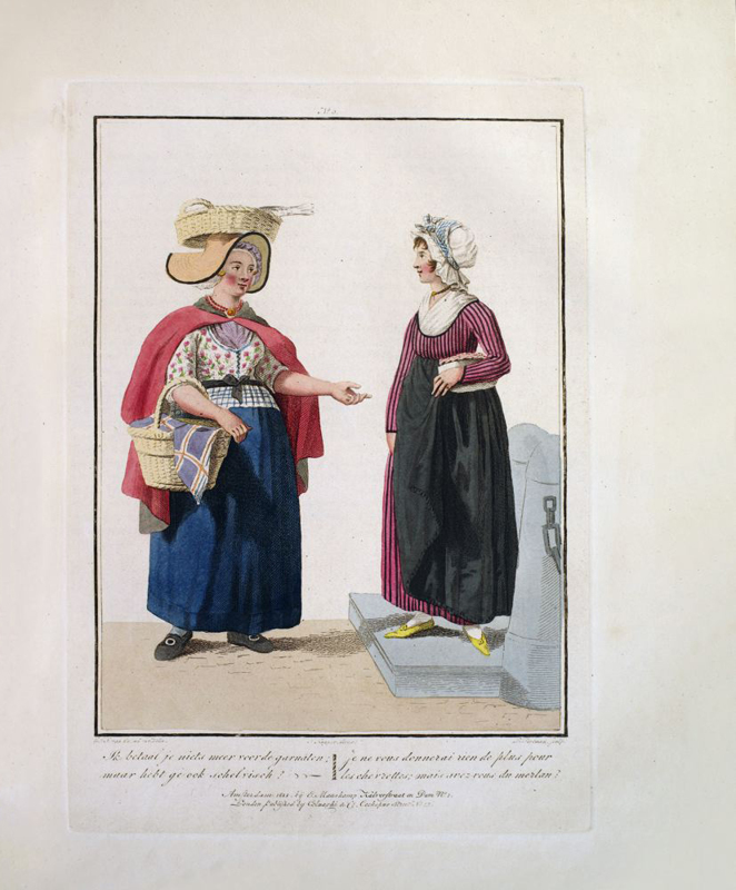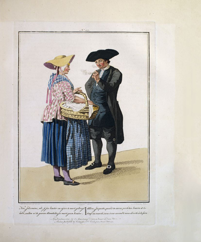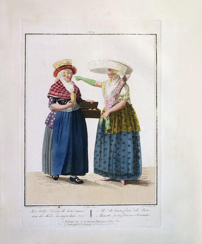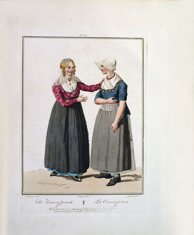 Oblong 4to, title in French & Dutch, preface, description of plates in two languages, 20 hand-coloured aquatint plates, plus frontispiece. Rebound in modern green cloth, lettered in gilt to spine. Minor foxing and browning throughout. Coloured plates in order: 1. La Muse du dessin remet son Ouvrage a Mercure. 2. Une Femme bourgeoise & sa Fille, allant a l'Eglise. 3. Ecoutez, mon ami ! Encore un Sou ce sont mes etrennes. 4. Je vous annonce la mort de 5. Une pinte, ma fille ! Pas d'avantage. 6. Une Mere et sa Fille membres de la Societe des Freres Moraves, a Seist. 7. C'est un prix fait: il n'y a rien a en rabattre. 8. Mon homme, comme il faisoit froid au Sermon ! 9. Allons, file, file, ma Femme - mes filets Sont tous decheres. 10. Je ne vous donnerai rien de plus pour les chevrettes; mais avez vous du merlan? 11. Quoi ! Avec ces beaux habits, vous allez en traineau a Melqueren? 12. Ah ! Du beure frais ! Eh ! Bien, Annette portez le a ma Servante. 13. Un Paysan et une Paysanne de la Gueldre, revenant de traire les vaches. 14. Allons, Jacquette, quand tu auras porte ton beurre et les oeufs au marche, nous irons ensemble nous divertir a la foire. 15. Un Paysan & une Paysanne de Schouren, allant au marche de Zirezee. 16. Comment, Voisine ! Vous allez ainsi vous divertir? 17. Bonjour, jolie Fille ! Vous allez aussi a Bois-le-duc? 18. La Promenade. 19. Chere Marie ! Voici un bouquet, avec une lettre et une boite toutes remplies de douceurs. 20. Belle Fiancee ! Toutes Sortes de prosperite. 21. La Conversation.