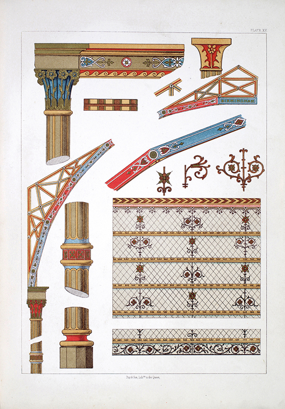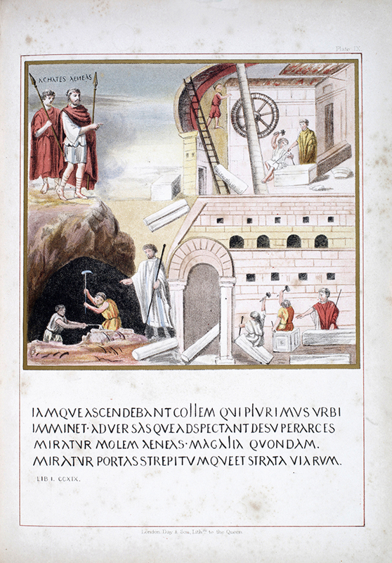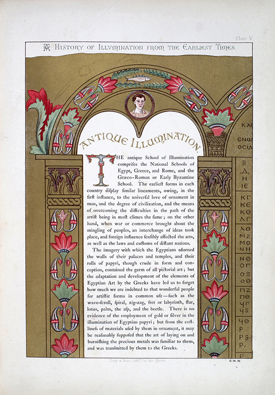 Folio. Half crimson calf over marbled boards with single gilt filet to boards; raised bands in blind to spine; title in gilt to spine; bookbinders label to lower front pastedown; edges lightly soiled; some plates with light foxing; Good condition with only occasional foxing. A scarce Noel Humphrey's chromolithographed hand-coloured production with 21 pages of illuminations. Illustrated by Day & Son Color illustration. FIRST EDITION. Purple ink stamp: "Thos H. Moxon" to prelim. *Ron Norman of Hartlepool carried out rebinding and restoration work on this book. (Ronnorm@aol.com)* Coloured plates in order: 1. Frontispiece. Medieval Religious Illumination. 2. Title page. 3. Initial letter 'T' and page of text surrounded by an intricate coloured border design. 4. Initial letter 'T' and a page of text with a coloured border. 5. Assorted initial letters in colour. In different languages. 6. Attractive border decoration to a page of text concerning 'Antique Illumination.' 7. Mediaeval Greek illuminator. 8. Various border illuminations used to decorate medieval manuscripts etc. 9. Illuminated scenes of the construction of a large building, showing the stone being quarried, stonemasons at work, nobleman overseeing the work. Latin inscription beneath. 10. Various border illuminations used to decorate medieval manuscripts etc. 11. The month of January, complete with 'red-letter' days and filled with ornate and attractive marginal illuminations. 12. As above, but for February. 13. Border illumination to a page of text. 14. Stunning illuminations to a page of Latin text. 15. The month of March, complete with 'red letter' days and other religious observances with a series of medieval farming illuminations. 16. A Russo-Byzantine Book-Cover, 14th or 15th Century. 17. Large initial letter 'S.' 18. The month of April, with religious observances marked out, surrounded by beautiful illuminations. 19. Various medieval illuminations used in manuscripts. 20. Large initial letter 'B.' 21. The month of May in muted tones. 22. Initial letters 'C' & 'P' complete with attractive border illumination, beginning a page of text. 23. A stunning illumination of a page of Latin text. 24. Ladies-in-Waiting (?), all seated in a royal bed-chamber, watching a woman kneeling while presenting an illuminated book to their noblewoman. 25. Initial letter 'A' and attractive marginal illumination to a page of text.