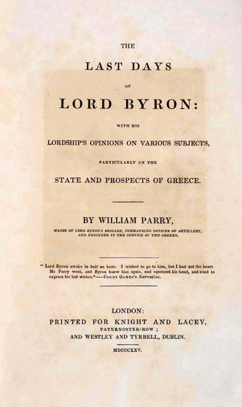 In the weeks before Byron’s death William Parry (1773–1859) became the poet’s confidante and partisan. His memoir is a particularly valuable record of Byron’s intentions and actions at Missolonghi.