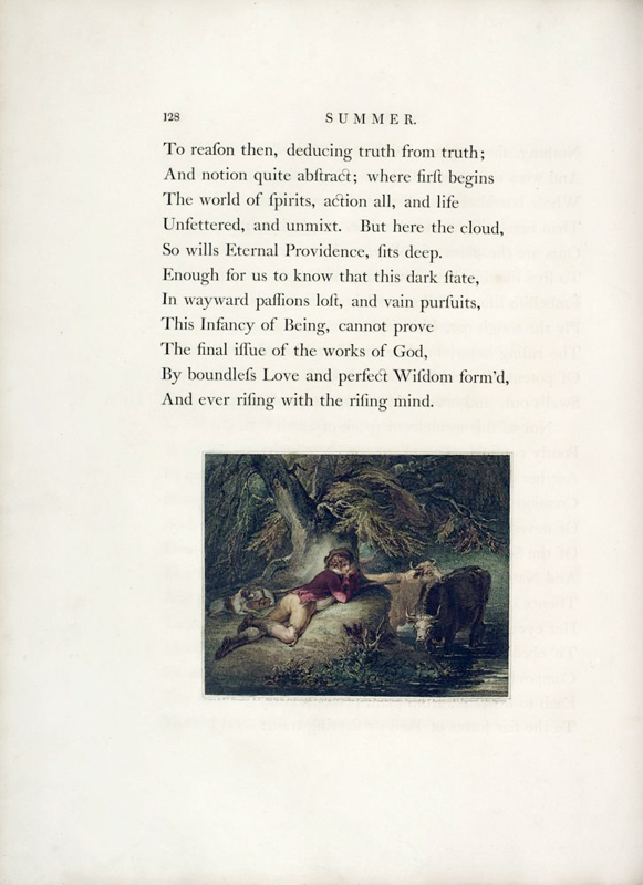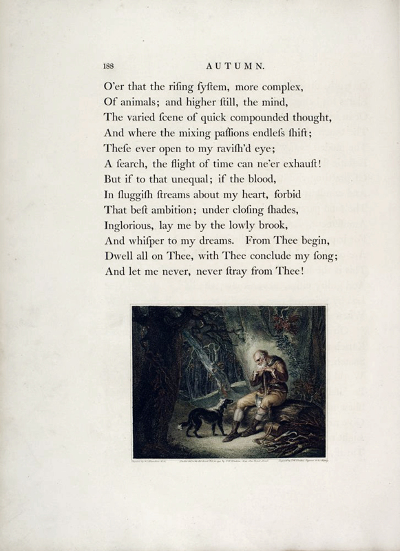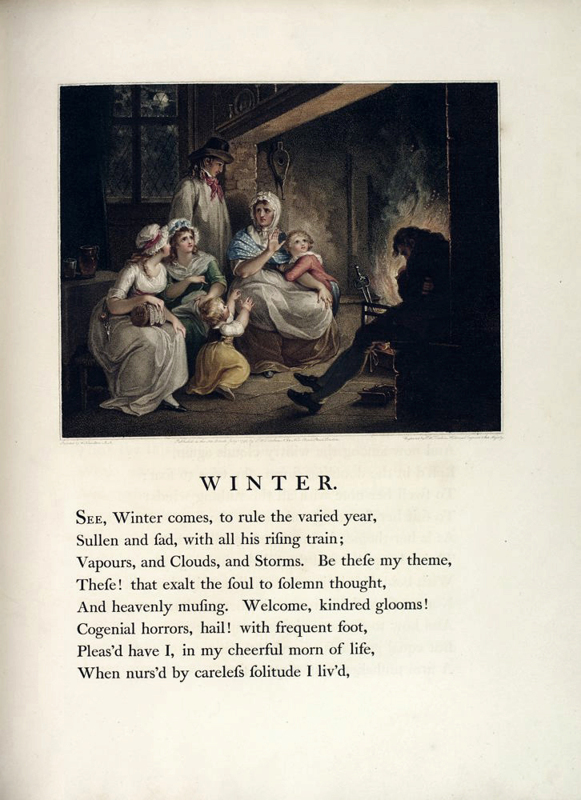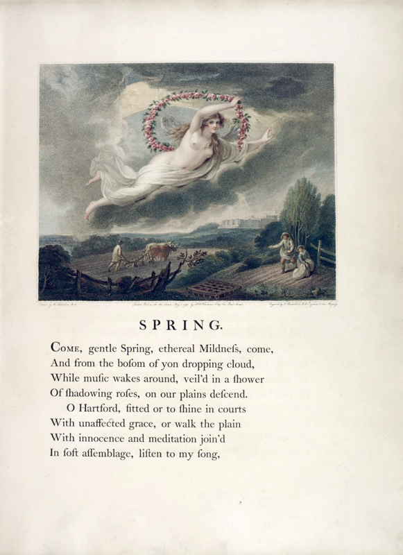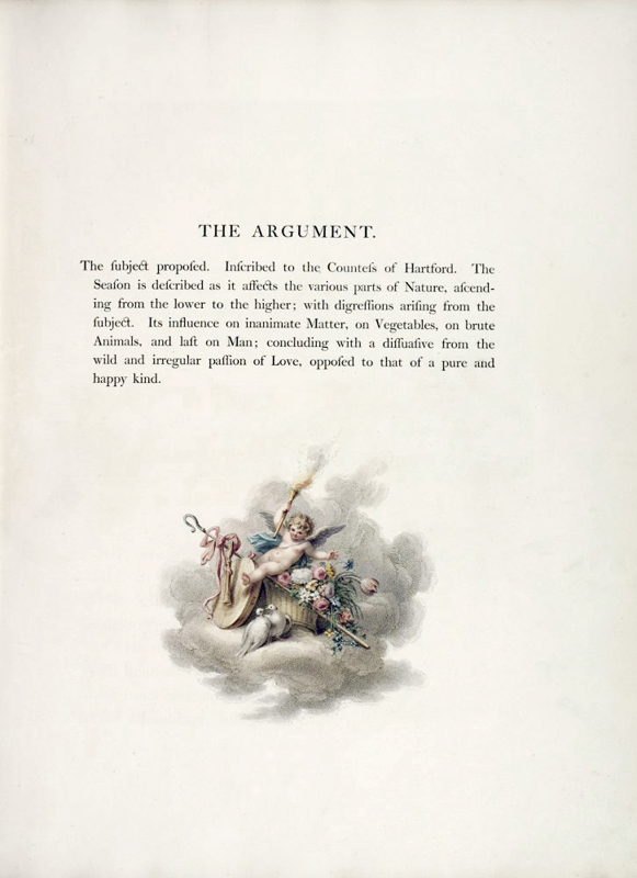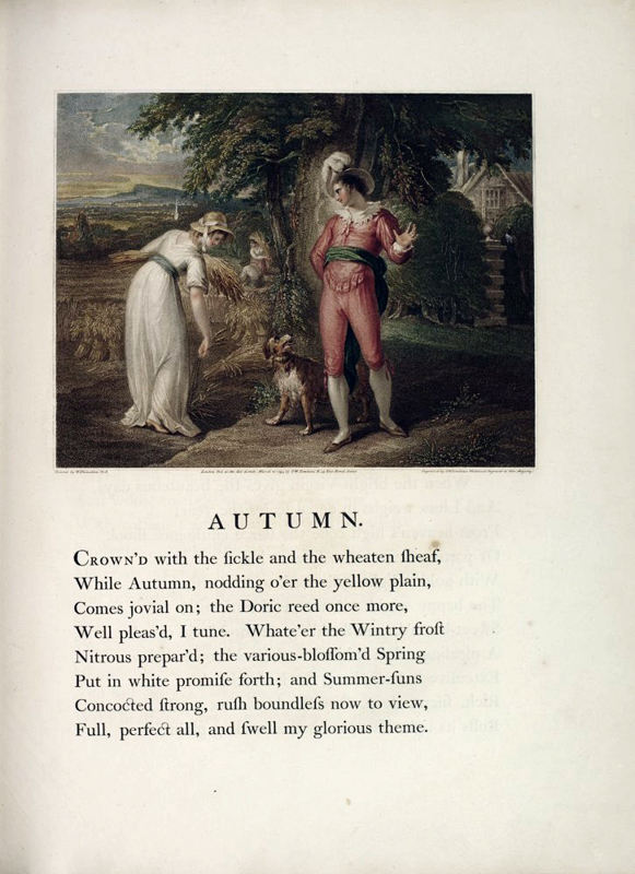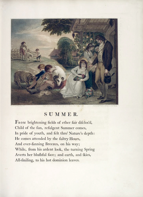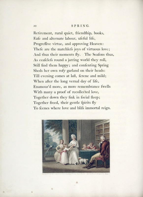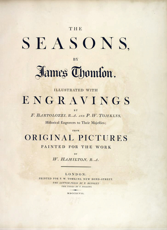 A rare example in that the plates are printed in colours (and not hand-coloured). Beautifully bound, from the library of "the father of modern advertising." The words "Engraver to Her Majesty" appear below the name of Tomkins on the dedication. Provenance: Thomas J. Barratt (1841-1914), chairman of the soap manufacturer A. & F. Pears. (bookplate). Folio (47.2 x 37.5cm). Half-title, engraved calligraphic dedication by H. Ashby after T. Tomkins. Colour-printed stipple-and line-engraved frontispiece, 6 plates, and 15 illustrations by F. Bartolozzi and P.W. Tomkins after W. Hamilton. Extra-illustrated with a watercolour drawing based on the frontispiece, signed by W. Hamilton, inlaid before the half-title. Some marginal spotting in plates, occasional marginal soiling in text leaves, offset from frontispiece on the title. Contemporary green straight-grain morocco, wide border made up of inlaid red and black morocco gilt-tooled with alternating lilies and scrolls, inner gilt frame with a roll-tooled border of ferns, spine richly gilt, edges gilt, Greek key gold-stamped dentelles with leafy border in blind, crimson watered-silk doublures and endleaves, by Staggmeier & Welcher, in a black morocco slipcase; neat repairs to joints. It is said that perhaps only three copies of this work were issued with the engravings printed in colours; one for Queen Charlotte, one for Princess Elizabeth, daughter of King George III, and the other for Walter Fawkes, Esq, of Farnley Hall, which copy this one is said to be. It is evident from the excellent quality of the engravings in this volume that the most exceptional care was taken in the printing; the colours are most brilliant, and the plates are wonderfully fine specimens of colour printing. Colour plates in order: 1. [extra watercolour illustration (not called for) based on the frontispiece illustration - signed by Hamilton]. 2. Frontispiece monument illustration. 3. Vignette of Cupid, Flowers, and Doves &c beneath the text. 4. Half-page plate of 'Spring.' 5. Parental Affection. 6. Small plate depicting a scene of family happiness beneath the text. 7. Half-page vignette of a young boy fishing beneath the text. 8. Half page plate of Sheep Shearing, above text 'Summer.' 9. Celadon and Amelia. 10. Musidora. 11. Small plate depicting a young boy with a dog and cattle beneath the text. 12. Half-page vignette of 'Reapers Repose,' beneath the text. 13. Half page plate 'Palemon's First Sight of Lavinia.' 'Autumn.' 14. Lavinia and her Mother. 15. Small plate of 'The Woodsman' beneath the text. 16. Small vignette of a young boy skating beneath the text. 17. Half-page plate of 'The Goblin's Story' being told by a fireside. 'Winter.' 18. The Wolves descending from The Alps. 19. Small plate ' The Winter of Life,' beneath the text. 20. Vignette of an Angel and a Silver Lyre. 21. Half page plate ' The Shepherds Flute' above text. 'Hymn' 22. Small plate 'The Reaper Returning Home,' beneath the text.