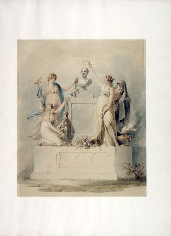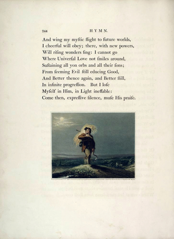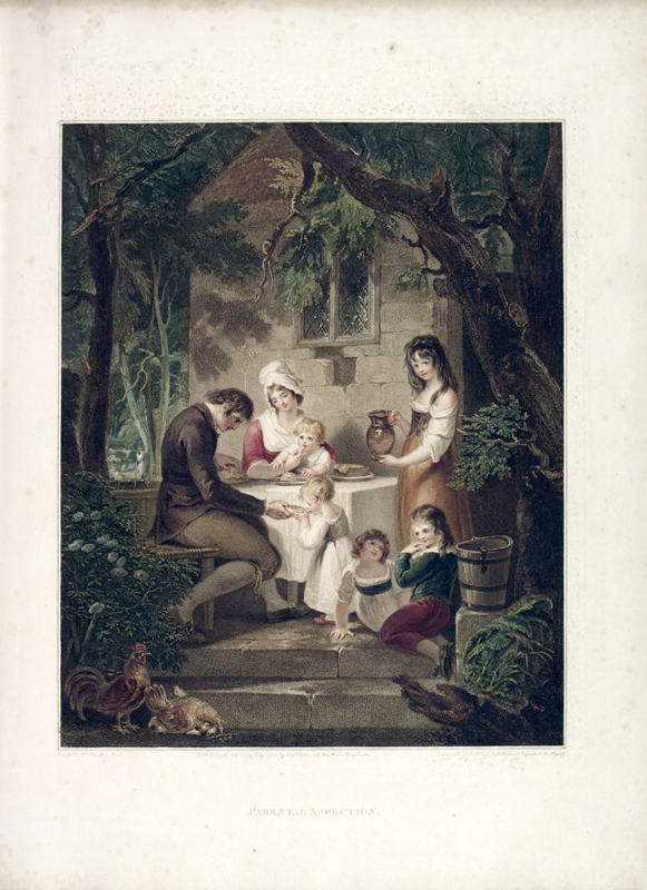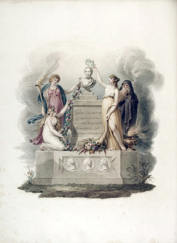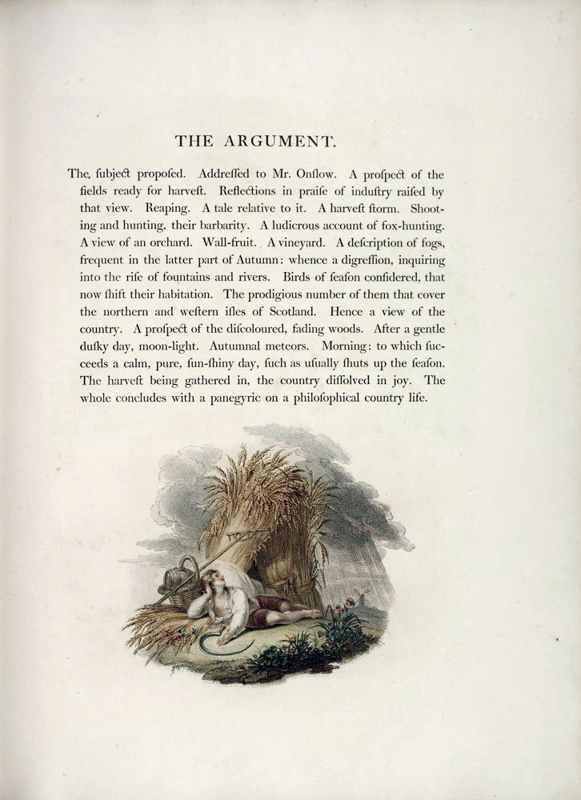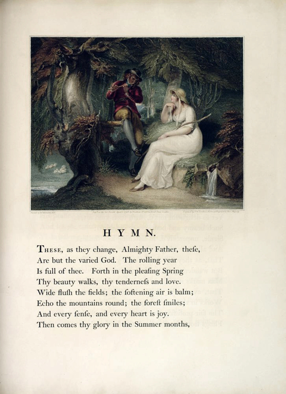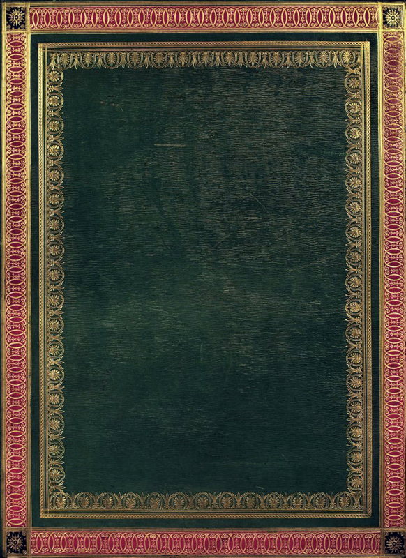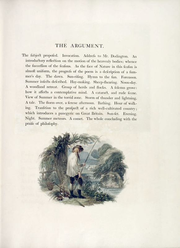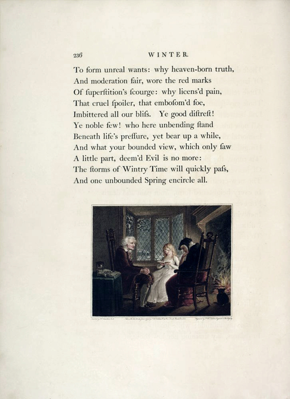 A rare example in that the plates are printed in colours (and not hand-coloured). Beautifully bound, from the library of "the father of modern advertising." The words "Engraver to Her Majesty" appear below the name of Tomkins on the dedication. Provenance: Thomas J. Barratt (1841-1914), chairman of the soap manufacturer A. & F. Pears. (bookplate). Folio (47.2 x 37.5cm). Half-title, engraved calligraphic dedication by H. Ashby after T. Tomkins. Colour-printed stipple-and line-engraved frontispiece, 6 plates, and 15 illustrations by F. Bartolozzi and P.W. Tomkins after W. Hamilton. Extra-illustrated with a watercolour drawing based on the frontispiece, signed by W. Hamilton, inlaid before the half-title. Some marginal spotting in plates, occasional marginal soiling in text leaves, offset from frontispiece on the title. Contemporary green straight-grain morocco, wide border made up of inlaid red and black morocco gilt-tooled with alternating lilies and scrolls, inner gilt frame with a roll-tooled border of ferns, spine richly gilt, edges gilt, Greek key gold-stamped dentelles with leafy border in blind, crimson watered-silk doublures and endleaves, by Staggmeier & Welcher, in a black morocco slipcase; neat repairs to joints. It is said that perhaps only three copies of this work were issued with the engravings printed in colours; one for Queen Charlotte, one for Princess Elizabeth, daughter of King George III, and the other for Walter Fawkes, Esq, of Farnley Hall, which copy this one is said to be. It is evident from the excellent quality of the engravings in this volume that the most exceptional care was taken in the printing; the colours are most brilliant, and the plates are wonderfully fine specimens of colour printing. Colour plates in order: 1. [extra watercolour illustration (not called for) based on the frontispiece illustration - signed by Hamilton]. 2. Frontispiece monument illustration. 3. Vignette of Cupid, Flowers, and Doves &c beneath the text. 4. Half-page plate of 'Spring.' 5. Parental Affection. 6. Small plate depicting a scene of family happiness beneath the text. 7. Half-page vignette of a young boy fishing beneath the text. 8. Half page plate of Sheep Shearing, above text 'Summer.' 9. Celadon and Amelia. 10. Musidora. 11. Small plate depicting a young boy with a dog and cattle beneath the text. 12. Half-page vignette of 'Reapers Repose,' beneath the text. 13. Half page plate 'Palemon's First Sight of Lavinia.' 'Autumn.' 14. Lavinia and her Mother. 15. Small plate of 'The Woodsman' beneath the text. 16. Small vignette of a young boy skating beneath the text. 17. Half-page plate of 'The Goblin's Story' being told by a fireside. 'Winter.' 18. The Wolves descending from The Alps. 19. Small plate ' The Winter of Life,' beneath the text. 20. Vignette of an Angel and a Silver Lyre. 21. Half page plate ' The Shepherds Flute' above text. 'Hymn' 22. Small plate 'The Reaper Returning Home,' beneath the text.