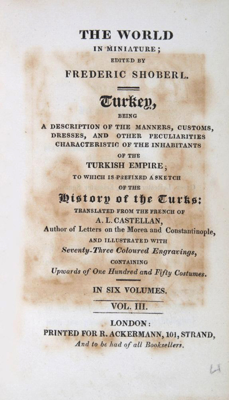 A very good 6-volume set in contemporary half calf bindings with 73 hand-coloured plates. A scarce title in the World in Miniature series which ran to 43 volumes. The books in the series "The World in Miniature" focused on different countries throughout the world, and were accompanied by numerous engravings. The present item contains the series' six parts on the history of the Ottoman Empire, the life of its citizens, their dress, and their customs.