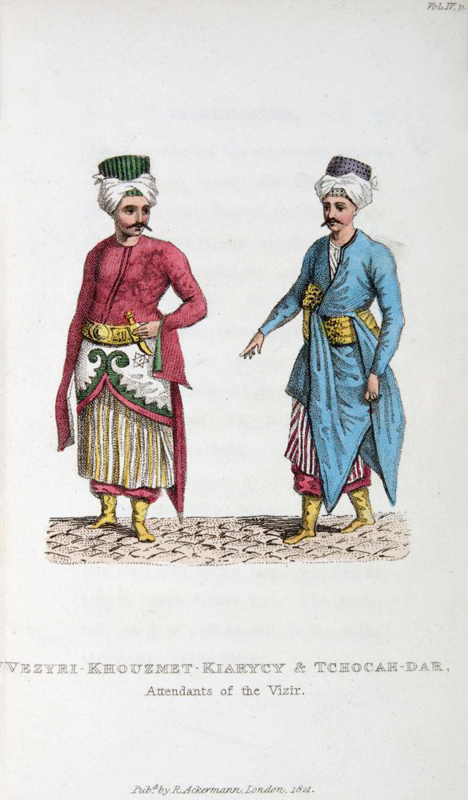 12 mo. In striking full green morocco with single gilt fillet to boards; gilt raised bands, decorative gilt motifs and title in gilt to spine; top edge gilt; marbled endpapers; bookplate of: 'Julia Parker Wightman' to front pastedowns. Six vols with 73 hand-coloured plates in good condition. Coloured plates in order: Volume 1. 1. Frontispiece. Death of Sultan Anurat I. 2. Othman I. First Emperor of the Turks. Volume 2. 3. Frontispiece. Discovery of the Sultana Kieuzel. 4. Mahmud II. Reigning Emperor of the Turks. Volume 3. 5. Frontispiece. The Heir Apparent to the Throne / The Chief Khatoun or Favourite Sultana. 6. Visir / The Sultan or Grand Signor. 7. Musician / Dancer / Khouzmat-Kar-Seray Governess of the Harem. 8. Qyzlar-Agha, Chief of the Black Eunuchs / Odahlyc. A Woman of the Harem. 9. Capou-Aghacy, Chief of the White Eunuchs. 10. Itch-Oghlan, A Page of the Chamber / Rekab-Dar-Agga, A Stool-bearer. 11. An Itch-Oghlan, writing with the Calam / A Writing Master. 12. Instruments for Writing (A). 13. Instruments for Writing (B). 14. Dulbend-Dar-Agha, Turban bearer to the Sultan / Silihh-Dar, Swordbearer to the Sultan. 15. Itch-Oghlan-Aghacy, Page to the Sultan / Tezkierehdjy-Bachy, Secretary to the Grand Signor. 16. Sazend-Bachy, Music-master of the Seraglio / Hhalvahdjy, Confectioner to the Seraglio. 17. Musical Instruments (C). 18. Musical Instruments (D). 19. Tchenguy Avrety, A Female Dancer / Tchenguy, A Dancer. 20. Capydjy-Bachy, Chiefs of the Porters. Volume 4. 21. Frontispiece. Mamalukes. 22. The Grand Vizir with the Army. 23. Vezyri-Khouzmet-Kiarycy & Tchocah-Dar, Attendants of the Vizir. 24. A Spahi / A Dely. 25. Reis Effendy, Minister for Foreign Affairs / Drogman, Interpreter. 26. Tchaouch-Bachy, Chief Introducer of Ambassadors / Tchaouch, A common Tchaouch. 27. Sekban-Bachy, Third Officer of Janissaries / Yegnytschery, A Janissary in his State Dress. 28. Achdjy, Cook / Achdjy-Bachy, Head Cook of the Janissaries. 29. Cazan, or Ketle of the Janissaries / Tchorbadjy, Ladle bearer, or Captain of Janissaries. 30. Coulloucdjy, Inferior Officer of Janissaries in his ordinary Dress / Bach-Tchaouch, Serjeant-Major of Janissaries. 31. Thopdjy, A Gunner of the Nizam-djedyd / Nefer, A Soldier of the Nizam-djedyd. 32. Hamm-al, a Porter / Sacca, a Water Carrier. 33. [Trumpets, Bits, Stirrups &c.] Plate H. 34. Standards & Colours. Plate E. 35. Arms, Offensive & Defensive. Plate F. 36. [Drum, Ketle Drums, Fire Javelins &c.] Plate G. 37. Levanty Roumy, A Greek Sailor / Levanty, A Turkish Marine. Volume 5. 38. Frontispiece. Turbeh, Tomb of a Sultan / Mufty, Chief Officer of the Law. 39. Ulema or Molla / Istambol Cadhycy, Judge of Constantinople. 40. Turning Dervises. 41. A Dervise of Constantinople / A Dervise of Syria. 42. Postures of Prayer. 43. A Mosque. 44. A Fountain. 45. A Carriage called Arabah. 46. A Turkish Tomb. Volume 6. 47. Frontispiece. A Woman of Aleppo / A Woman of Antioch. 48. A Turk in a Pelisse / A Turk in his Shawl. 49. [Turbans] Plate A. 50. [Turbans] Plate B. 51. [Turbans] Plate C. 52. A Turkish Woman from the Country / A Turkish Woman of Constantinople. 53. Greek Women / Turkish Woman [both] in Town Dresses. 54. A Bedouin Woman / A Bedouin Arab. 55. A Bedouin Woman, making butter. 56. A Turk of St. Jean d'Acre / An Arab Woman of the Desert. 57. A Syrian / An Egyptian Woman. 58. Kurds. 59. Turkish Women making Bread. 60. Drusian Woman, grinding Corn. 61. A Turk of Tunis / A Trk of Damascus. 62. A Bosnian / A Tartar. 63. A Jew / An Armenian. 64. A Woman of the Island of Simia / A Woman of Pera. 65. Albanians. 66. Women of Scio / of Samos / & of Metelin. 67. Women of the Island of Andros. 68. A Woman of Spra / A Woman of Cyprus. 69. A Woman of the Island of Naxos / A Woman of the Island of Marmora. 70. A Woman of Argenteria / A Woman of Scio. 71. A Seller of Caimac / A Seller of Vegetables. 72. A Turkish Repast. 73. Fishing.