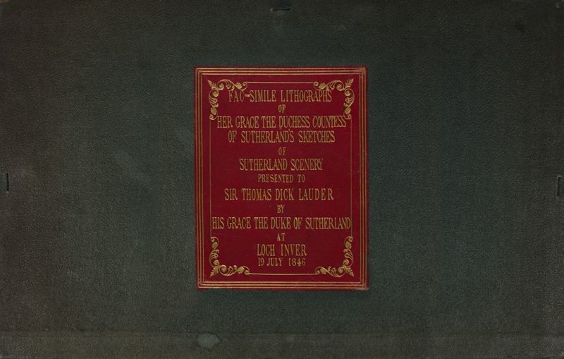 Folio (18 x 11.5 inches) green cloth folder, red calf gilt title label to upper board. 22 colour lithographed plates on paper mounts; annotated in ink, lower right corner. Loose as issued. Printed list of plates, map, 2pp. Signed letter by the Duke; dated July 19th, 1846, to "My dear Sir Thomas" (Sir Thomas Dick Lauder). Plates drawn by the Duchess of Sutherland and engraved by F.C. Lewis. Coloured plates in order: 1. The Coast of Assynt from Meal Dearg or the red lump. 2. Funovin Arkill in Keay Forest. 3. Cuniag. 4. Canisp. 5. Church & Village of Store. 6. Stack in Cogiach, Rosshire. 7. Entrance to Loch Broom in Rosshire. 8. Gairloch Point. 9. The Shiant Isles. 10. Island of Lewes. 11. Point of Melness. 12. Bay of Tongue. 13. Point of Land leading to the Ferry. 14. Church and Manse & Village of Tongue. 15. Ben Loyal. 16. (Untitled). 17. Ben Hope. 18. Ferry & Point opposite Ben Tongue. 19. Loch Assynt. Cuniag. Chalda House. Ardvreck Castle. 20. Loch Assynt. Shian Garve or the Rough Hill. 21. Entrance to Loch Row, on the Coast of Assynt. 22. The Church & Manse of Farr in Strathnaver.
