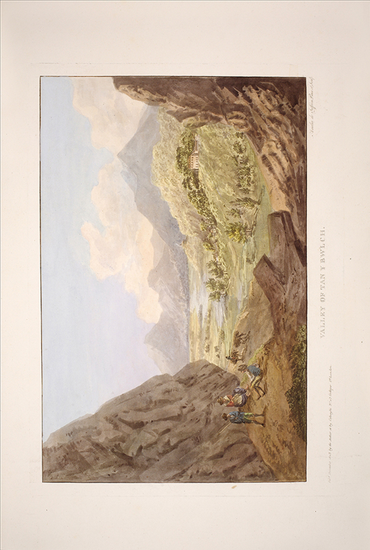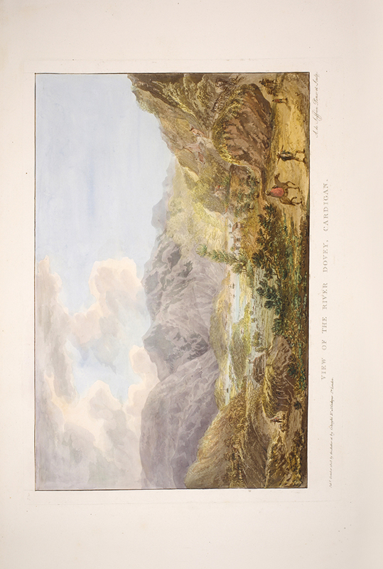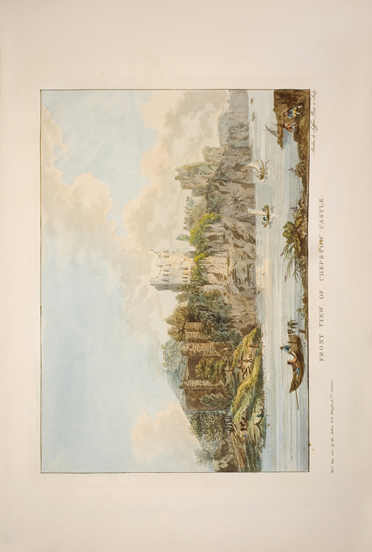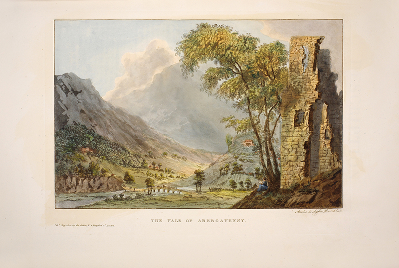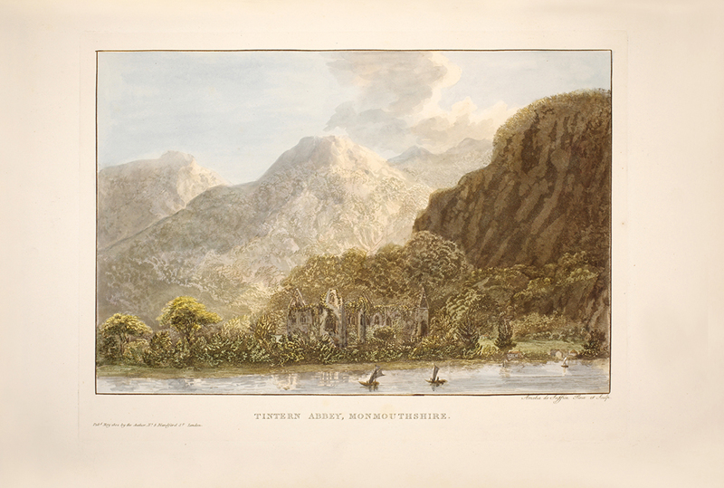 Folio, title page in English and French, 24 hand-coloured aquatint plates, in a quarter calf over contemporary (faded) red paper boards. Re-backed tan coloured spine with morocco title label in gilt. Brunet mentions that there were initially coloured proofs of the plates, but that series never appeared. Coloured plates in order: 1. Chepstow Castle, Monmouthshire. 2. Front View of Chepstow Castle. 3. Tintern Abbey, Monmouthshire. 4. From Piercefield Walks. 5. Inside View of Ragland Castle. 6. The Vale of Abergavenny. 7. Brick Kiln at Clydach, Monmouthshire. 8. Llantony Abbey, Monmouthshire. 9. Crickhowell, Brecon. 10. Cardiff Castle, Glamorgan. 11. Briton Ferry, Glamorgan. 12. Neath Abbey, Glamorgan. 13. The Bay of Swansea. 14. View taken in Penrice Park, Glamorgan. 15. Dinewar Park, Glamorganshire. 16. Kilgarren Castle. 17. The Devil's Bridge, Cardigan. 18. Scene near the Devil's Bridge, Cardiganshire. 19. Ruins of Aberystwith Castle, Cardiganshire. 20. View of the River Dovey, Cardigan. 21. Garth on the Dovey, Cardiganshire. 22. Mill near Dolgelly, Merionethshire. 23. Cader Idris. 24. Valley of Tan y Bwlch.