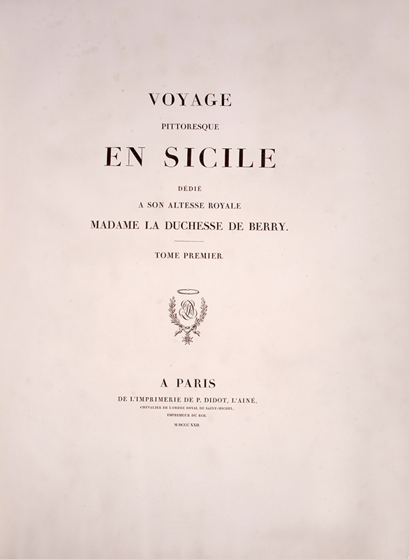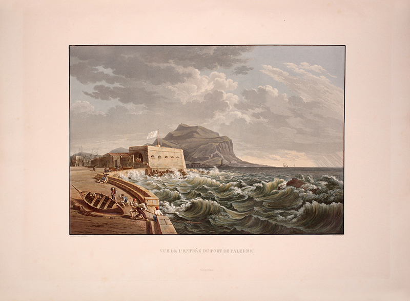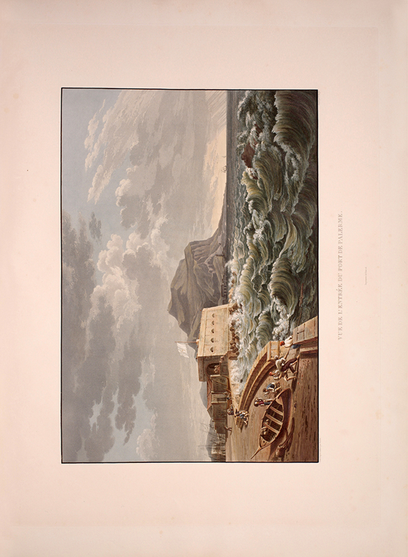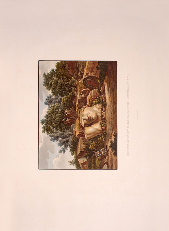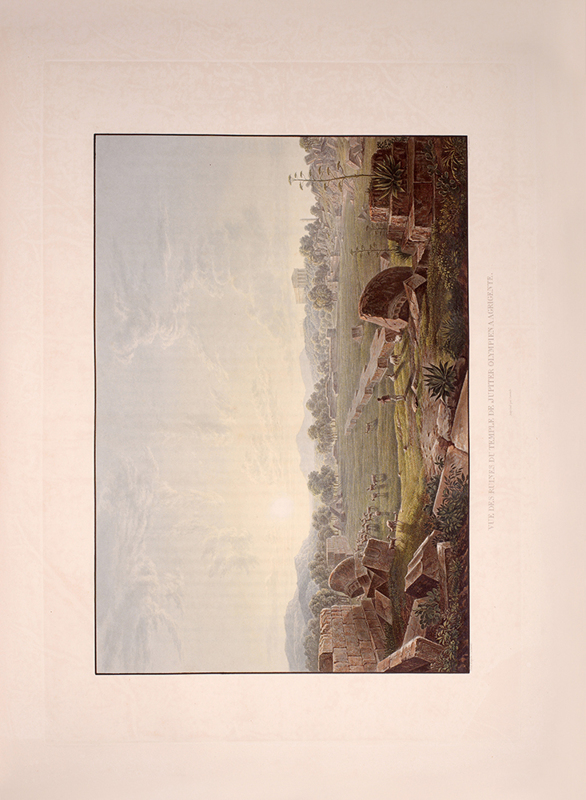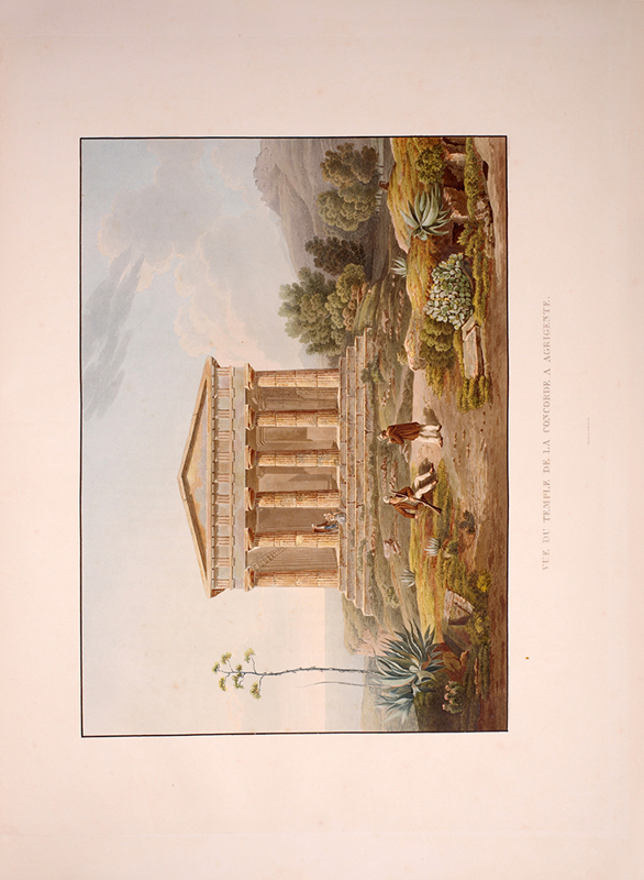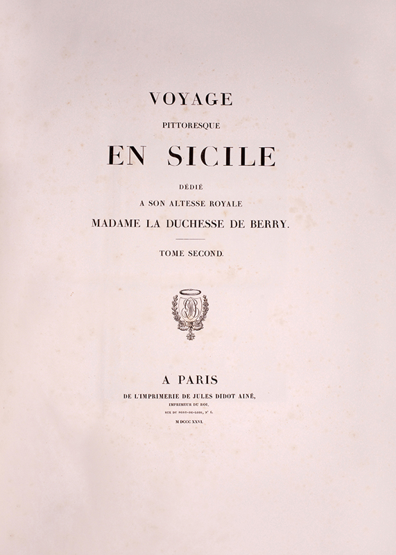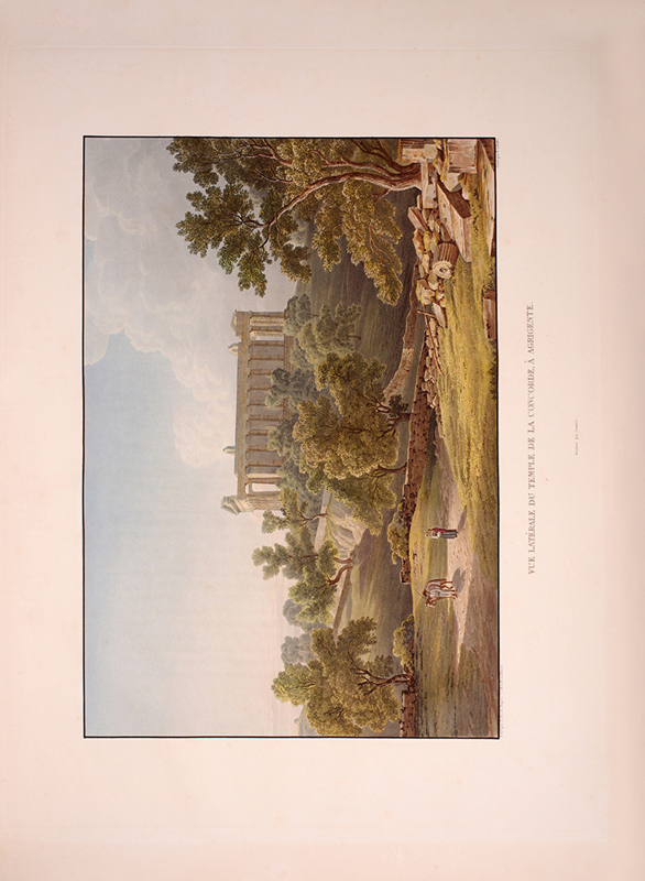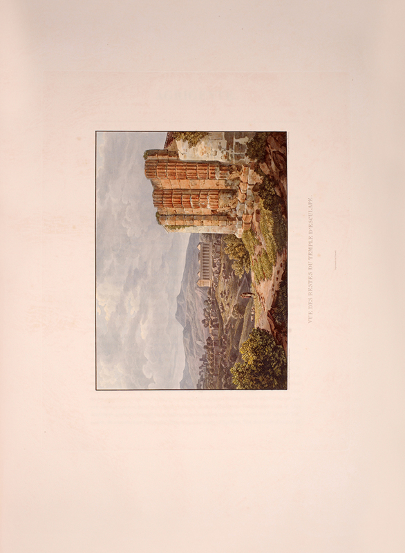 2 vols, large folio, two engraved maps of Sicily, one political and one physical; 92 hand-coloured aquatint plates, plate 37 is an uncoloured line engraving. In contemporary 1/2 red morocco over boards, with bands raised in gilt to spine, gilt lettered, and with marbled endpapers.The spine has been rebacked, and professionally repaired. Board extremities are lightly rubbed and worn. Bookplate of 'Giannalisa Feltrinelli' to front pastedown. An ambitious and great work. Rebinding and restoration work on this book was carried out by Ron Norman of Hartlepool (Ronnorn@aol.com) Coloured plates in order: Volume 1. 1. Vue de l'intérieur du Port de Palerme. 2. Vue de l'Entree du Port de Palerme. 3. Vue générale de Palerme prise des hauteurs de Santa Maria di Gesu. 4. Vue de la Cathedrale de Palerme. 5. Vue de l'Eglise de Santa Maria della Catena a Palerme. 6. Vue du Cloitre des Capucins a Palerme. 7. Vue extérieure de la Chapelle de Ste. Rosalie. 8. Vue de l'intérieur de la Chapelle et de la Grotte de Ste. Rosalie a Palerme. 9. Cloitre du Couvert de Ste. Maria di Gesu a Palerme. 10. Vue de la Bagaria et de la Baie de Palerme. 11. Vue d'un Aqueduct de la Bavaria aux environs de Palerme. 12. Vue du Couvent de St. Martin près Palerme. 13. Vue de Monreal. 14. Vue du Cloitre des Bénédictins a Monreal. 15. Vue de Sala di Partenico. 16. Vue du Theatre de Segeste. 17. Vue éloignée du Temple de Segeste. 18. Vue du Temple de Segeste. 19. Vue de l'intérieur du Temple de Segeste. 20. Vue du Port de Trapani. 21. Vue de l'ancien Port de Lilibee du Mont Erix. 22. Vue du Mont Eryx. 23. Vue des Carrieres de Campo Bello. 24. Ruines du Grand Temple a Selinunte. 25. Fragments des ruines d'un Temple de Selinunte. 26. Vue d'un Temple de Selinunte au bord de la Mer. 27. Vue du Couvent des Benedictines Sciacca. 28. Vue du Mont San-Calogero et des eaux thermales de Sciacca. 29. Vue de l'emplacement d'une partie de l'ancienne Agrigente. 30. Vue d'Agrigente, prise des hauteurs. 31. Vue des Murs d'Agrigente, prise du Temple du Junon Lucine. 32. Vue du Temple de Junon-Lucine et des debris des anciens Murs d'Agrigiente. 33. Vue des ruines des Temples de Jupiter Olympien et d'Hercule, a Agrigente. 34. Vue des ruines du Temple de Jupiter Olympien, a Agrigente. 35. Tete d'un des géants du Temple de Jupiter Olympien, a Agrigente. 36. Restauration d'un des géants du Temple de Jupiter Olympien, a Agrigente. 37. [uncoloured plate] 38. Vue du Temple de la Concorde, a Agrigente. 39. Vue latérale du Temple de la Concorde, a Agrigente. 40. Vue intérieure du Temple de la Concorde, a Agrigente. 41. Vue du Temple de Junon, a Agrigente. 42. Vue des Restes du Temple d'Esculape. 43. Vue du Tombeau de Theron a Agrigente. 44. Vue du Port de Gircenti. Volume 2. 45. Vue prise dans la Cavee d'Ispica. 46. Vue de Castello di Modica. 47. Vue de Syracuse prise du Theatre. 48. Vue d'un tombeaux antique dit le tombeau d'Archimede, a Syracuse. 49. Vue de la Cathedrale de Syracuse, ancien Temple de Minerve. 50. Vue intérieure d'une partie de la Cathedrale de Syracuse, ancien Temple de Minerve. 51. Vue de la Fontaine Arethuse, a Syracuse. 52. Escalier des Catacombes de l'Eglise de St. Jean a Syracuse. 53. Vue du Theatre de Syracuse. 54. Vue des Latomies des Capucins a Syracuse. 55. Vue des Grandes Latomies et de l'Oreille de Denys a Syracuse. 56. Vue intérieure des Latomies a Syracuse. 57. Vue des ruines du Temple de Jupiter Olympien, a Syracuse. 58. Vue de la Fontaine Cyane. 59. Vue de l'emplacement de la Maison de Timoleon, a Syracuse. 60. Vue d'un souterrain de l'Epipole, a Syracuse. 61. Vue des hauteurs de l'Epipole, a Syracuse. 62. Vue d'un tombeau antique près de Syracuse. 63. Vue de Catane. 64. Vue de la Chapelle de San-Salvatore, a Catane. 65. Entree du Musee du Prince Biscaris, a Catane. 66. Vue d'une Galerie de l'Amphiteatre de Catane. 67. Escalier du Theatre de Catane. 68. Vue des Ecueils des Cyclopes. 69. Vue de Jaci et du détroit de Messine. 70. Vue du Monte Rosso prise de San Nicolosi. 71. Vue de la Grotte des Chevres. 72. Vue de l'Etna de la Maison de Gemellaro. 73. Vue du Cratere de l'Etna. 74. Vue de l'intérieur du Cratere de l'Etna. 75. Vue d'une Gorge de l'Etna et du fiume Freddo. 76. Vue d'un Pont sur le Cantara. 77. Vue prise du Theatre de Taormine. 78. Vue de l'intérieur du Theatre de Taormine. 79. Vue de Taormine prise de Jardini. 80. Vue du Couvert des Capucins a Taormine. 81. Vue du Chateau de Saint-Alessia. 82. Vue de Messine. 83. Vue de Messine et des cotes de Calabre, prise des hauteurs du Télégraphie. 84. Vue de la Cathedrale et de la Place del Duomo, a Messine. 85. Chapelle souterraine dans la Cathedrale de Messine. 86. Vue de l'Etna et du Golfe de Milazzo. 87. Vue de ruines, a Tindare. 88. Vue du Golfe de Milazzo prise de Tindare. 89. Vue de Tusa. 90. Vue de Cefalu. 91. Vue de Termini. 92. Vue de la Baie de Termini.