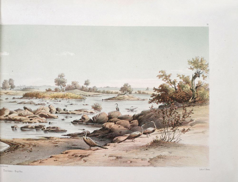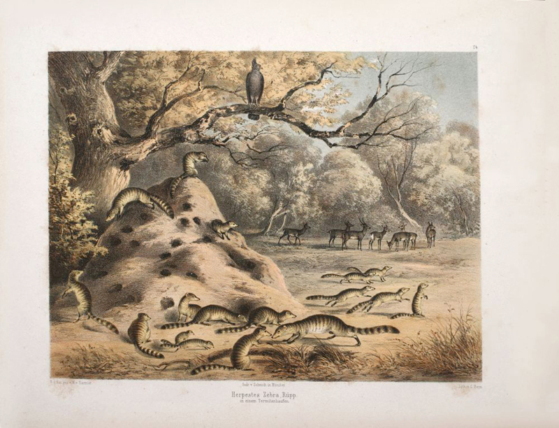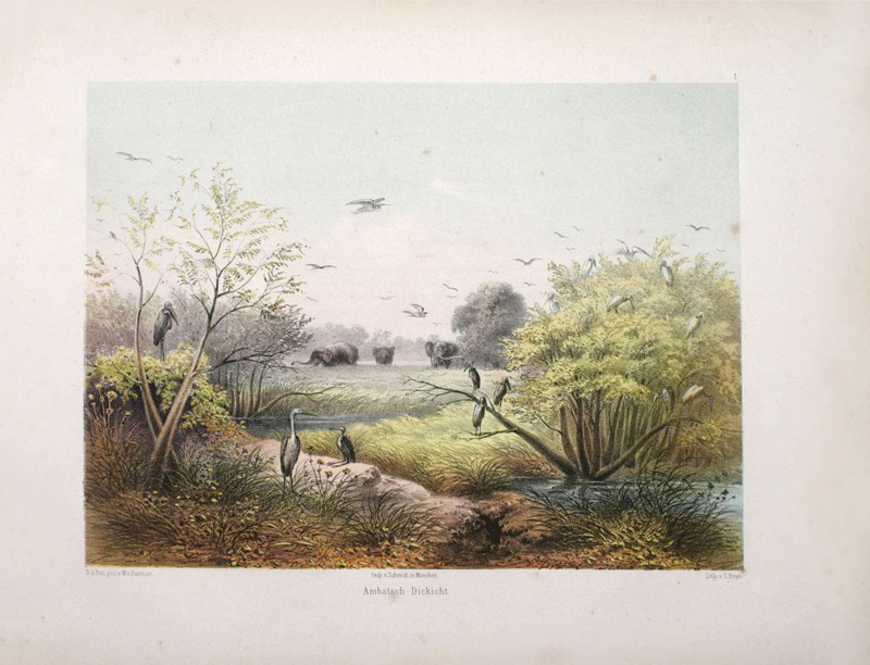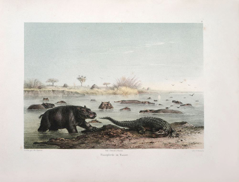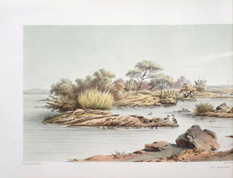 Oblong 4to, (10 1/4 x 13 inches), chromo-lithographed additional title, one folding lithographic map with the route marked by hand in red, 27 chromo-lithographed plates after von Harnier, one double-page, by C. Heyn, W. Diez, P. Herwegen and others, printed by Schmidt of Munich, original paneled cloth, upper cover titled in gilt; re-backed. The author’s sketches were prepared for publication by Johann Martin Bernatz (1802-1878) following von Harnier’s untimely death. Bernatz had earlier traveled in the area and produced a work after his drawings showing scenes in Ethiopia were published in 1852. Coloured plates in order: 1. Title page. 2. [Map] Karte zur Ubersicht von Wilhelm von Harnier's Reise auf dem Weissen Nil, 1860-61. 3. Ambatsch-Dickicht. 4. Schilluk-Neger. 5. Landschaft am Fluss. 6. Antilopen-Jagd. 7. Nuer-Neger. 8. Kitsch-Neger. 9. Fischende-Kitsch-Neger. 10. Tanz der Elliab und Bor-Neger. 11. Antilopen und Giraffen. 12. Flusspferde im Wasser. 13. Tschir-Neger. 14. Berg Nyerkani / Berg Belenjan. 15. Nilferdjagd. 16. Bari-Neger. 17. Gondokoro. 18. Berg Luluri / Berg Kerek. 19. Berg Logwek. 20. Der Katarakt Teremo-Garbo (double page). 21. Wandernde Schmiede. 22. Tanz der Bari. 23. Seribah Wilhelm von Harniers. 24. Kampf der Elliab und Tschir. 25. Buffelheerde im Sumpf. 26. Herpestes Zebra, Rupp in einem Termitenhausen. 27. Buffelheerde von einem Lowen uberrascht. 28. Fleischvertheilung an die Tschir-Neger. 29. Missionsstation "Zum Heiligen Kreuz".