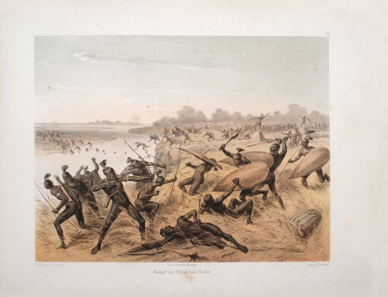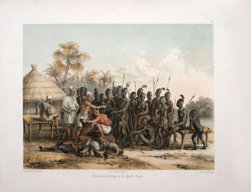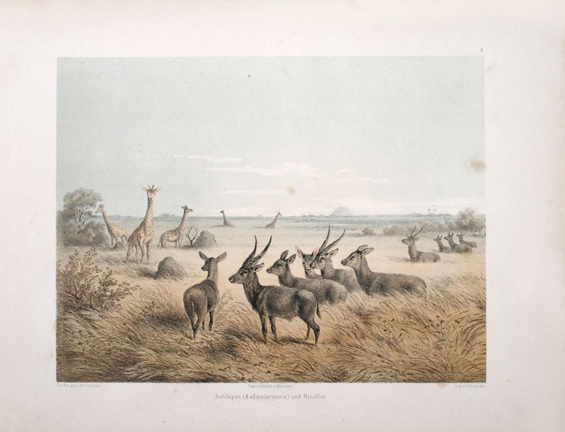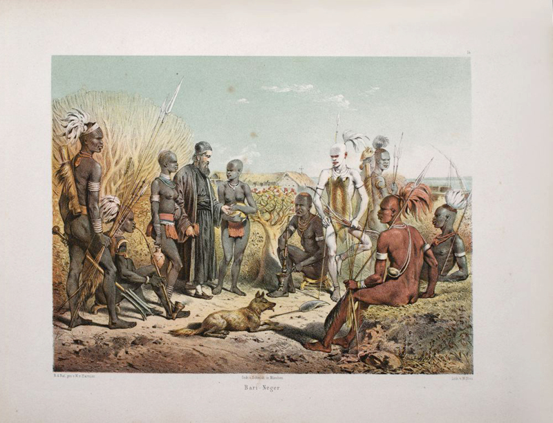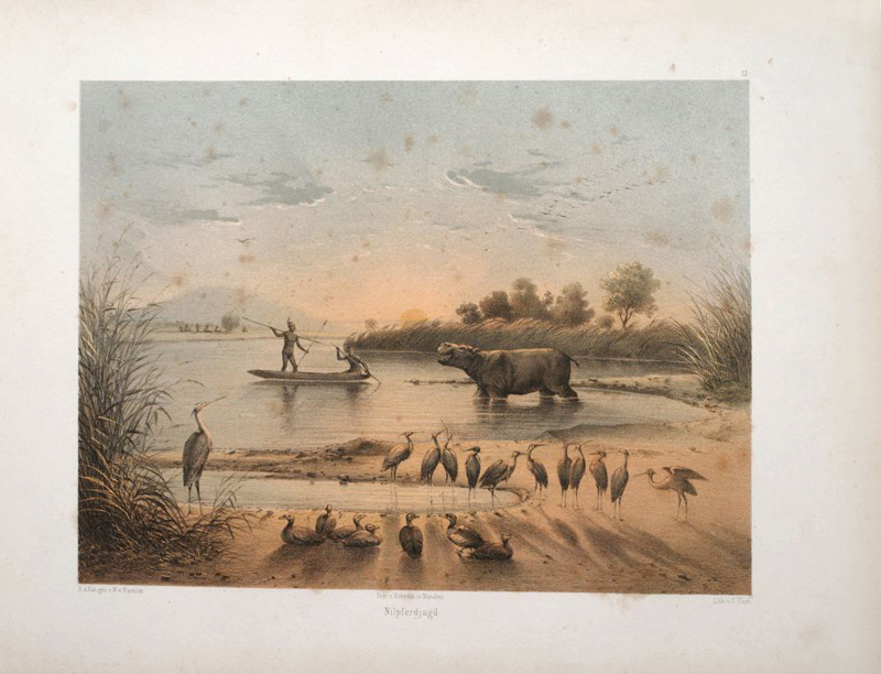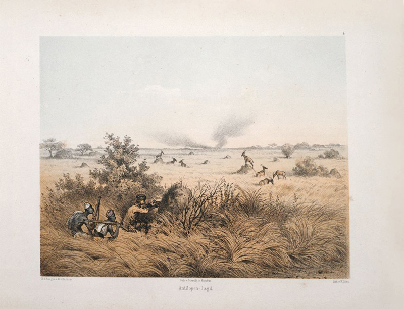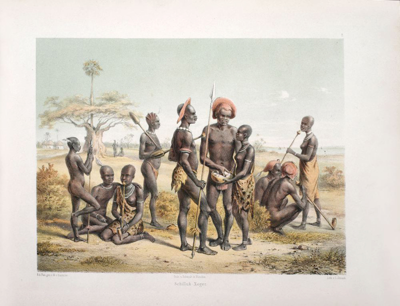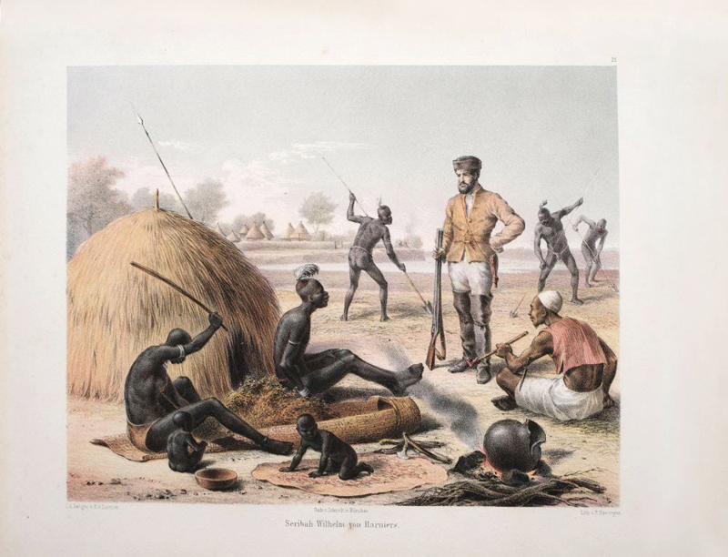 Only edition. - Diary of a Nile Trip by Wilhelm von Harnier (1836-1861) with numerous topographical and natural history observations. The author had an accident while hunting buffalo during the trip, which is why the work was published posthumously. - The decorative chromo-lithos, each with an explanation sheet, show members of the Schilluk, Bor, Seribah, Elliab, Bari, and Chir tribes, as well as animals and landscapes.
