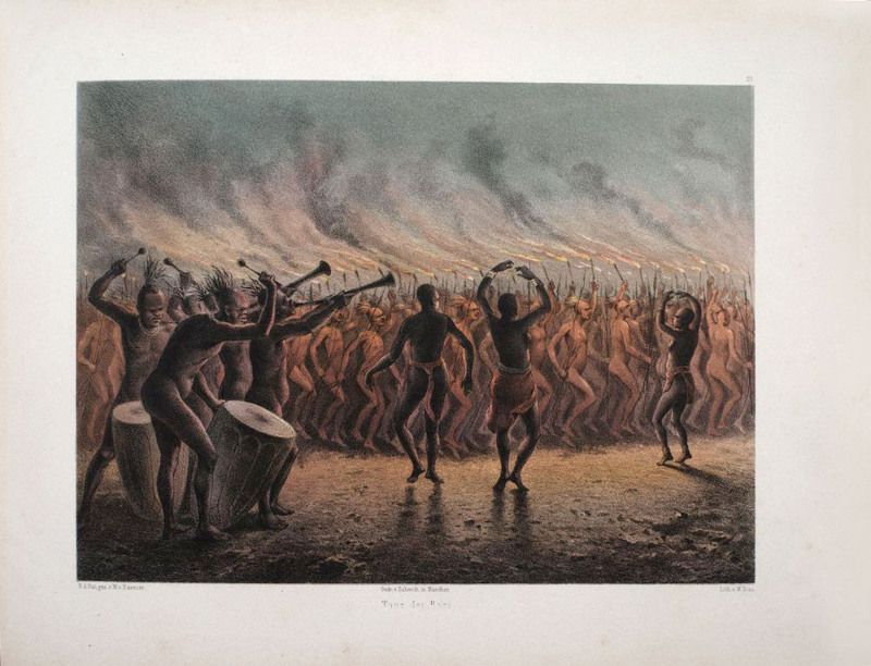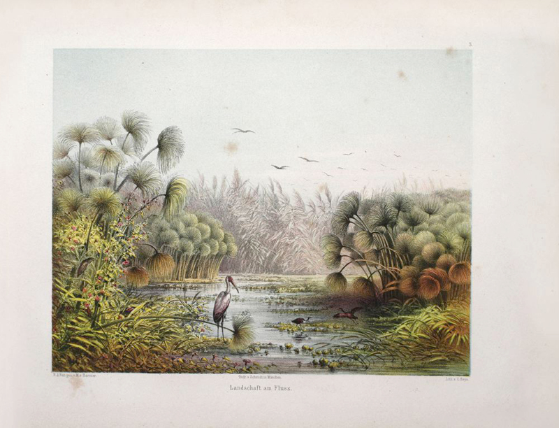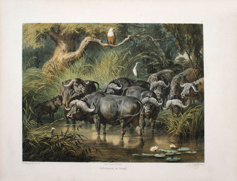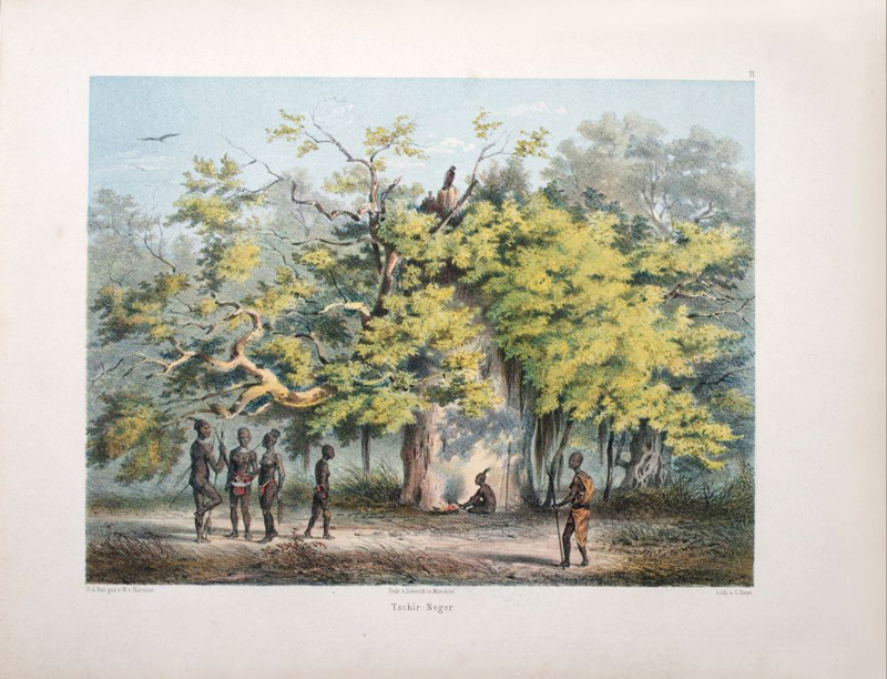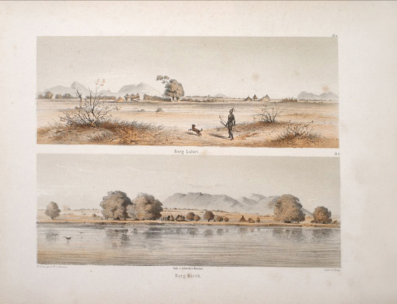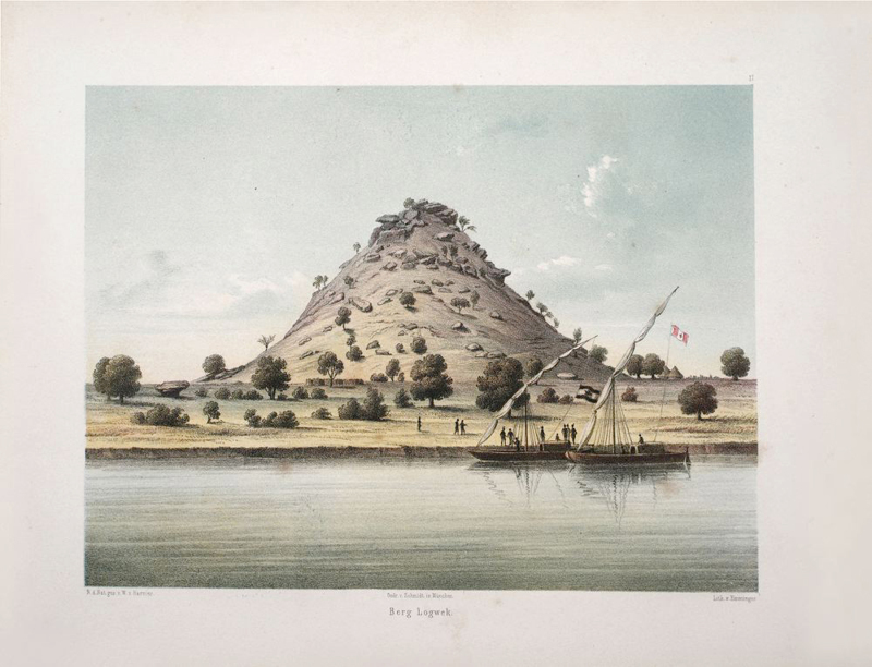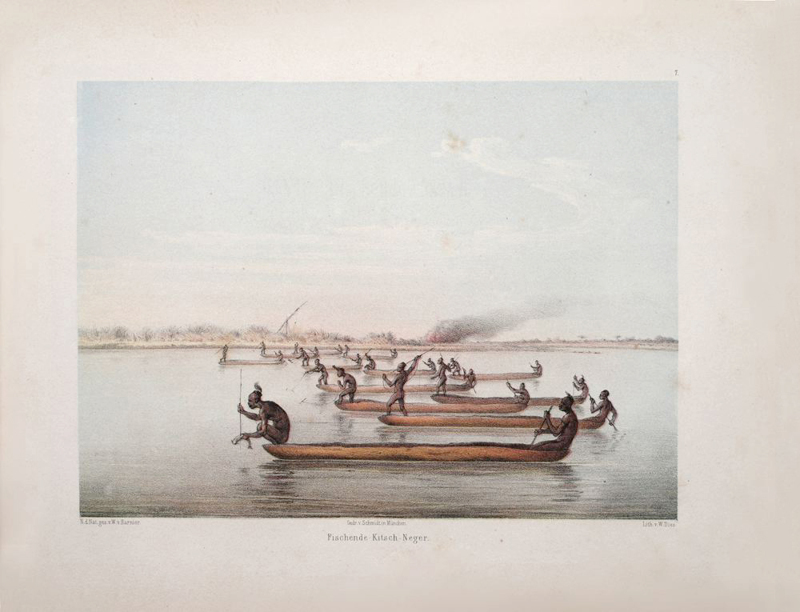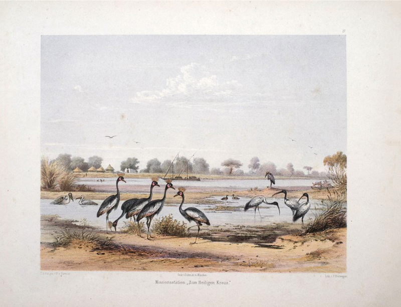 Only edition. - Diary of a Nile Trip by Wilhelm von Harnier (1836-1861) with numerous topographical and natural history observations. The author had an accident while hunting buffalo during the trip, which is why the work was published posthumously. - The decorative chromo-lithos, each with an explanation sheet, show members of the Schilluk, Bor, Seribah, Elliab, Bari, and Chir tribes, as well as animals and landscapes.