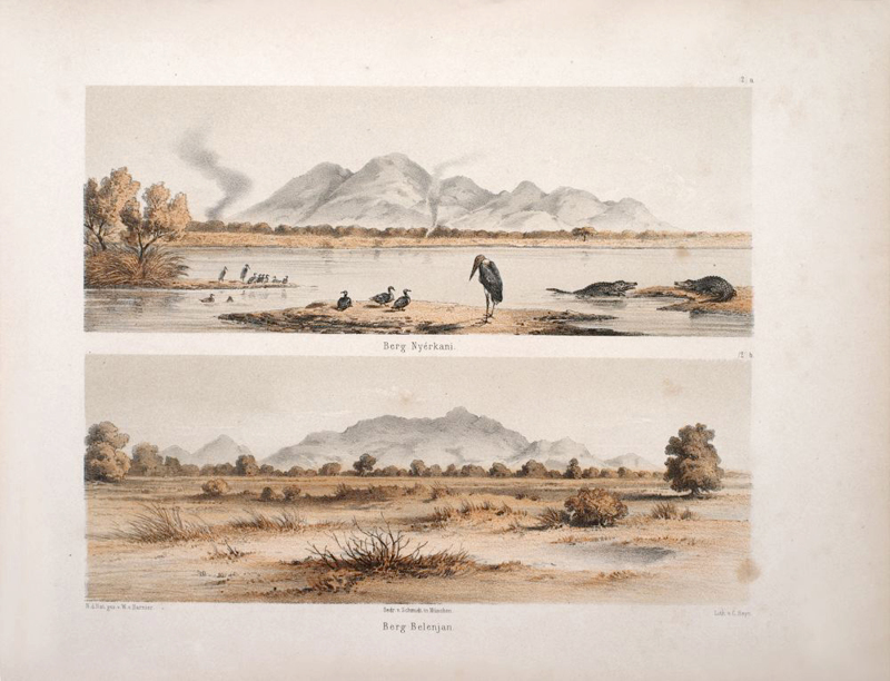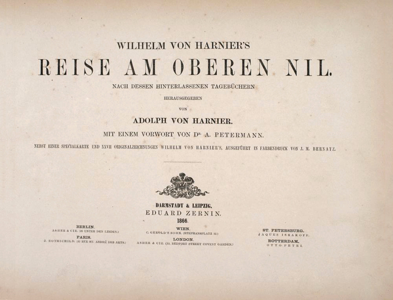 Wilhelm Harnier’s Reise am oberen Nil. Nach dessen hinterlassenen Tagebuechern herausgeben von Adolph von Harnier. Mit einem Vorwort von Dr A. Petermann. Nebst einer Specialkarte und XXVII Originalzeichnungen Wilhelm von Harnier’s ausgefuehrt in Farbedruck von J.M. Bernatz