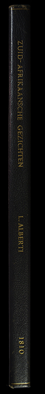 [South African Faces] Four folio hand-coloured lithographed plates in later marbled wrappers. They are nicely preserved in a modern folio 1/4 dark green morocco and tan cloth box with matching gilt title labels to the upper cover and spine. Alberti accompanied Gen. J.W. Janssens when he traveled to the cape as Governor of the Colony under the Batavian Republic in 1802. Alberti was a Captain in the 5th Battalion of the Corps de Waldeck and the following year was sent to Fort Frederick in Algoa Bay, where he took the direction of affairs relating to the Kaffirs and Hottentots and acted as landrost. The original drawings were done on the spot by Baron de Howen and worked up by Smies in Amsterdam, and then engraved and aquatinted by Portman. Howen was a Russian officer of artillery; obviously, a gifted amateur, and Jacob Smies, known chiefly as a caricaturist, was employed to give the work professional polish. Coloured plates in order: 1. Gezigt van eene Kaffersche Woon Plaats, aan de Zuidkust van Afrika. 2. Eene Horde van Kaffers op Reis. 3. Bijeenkomst van den Hoog Ed. Gestr. Heer Generaal J.W. Janssens. Gouverneur van de Kaap de Goede Hoop, met het Opperste Hoofd der Kaffers. Gaika ,in het Kafferland, aan de Katrivier, in Bloeimaand van 1803. 4. Gezigt van het Fort Frederik en ver der Militar etablissement aan de Algoa-Baai ,op de Zuidkust van Afrika.